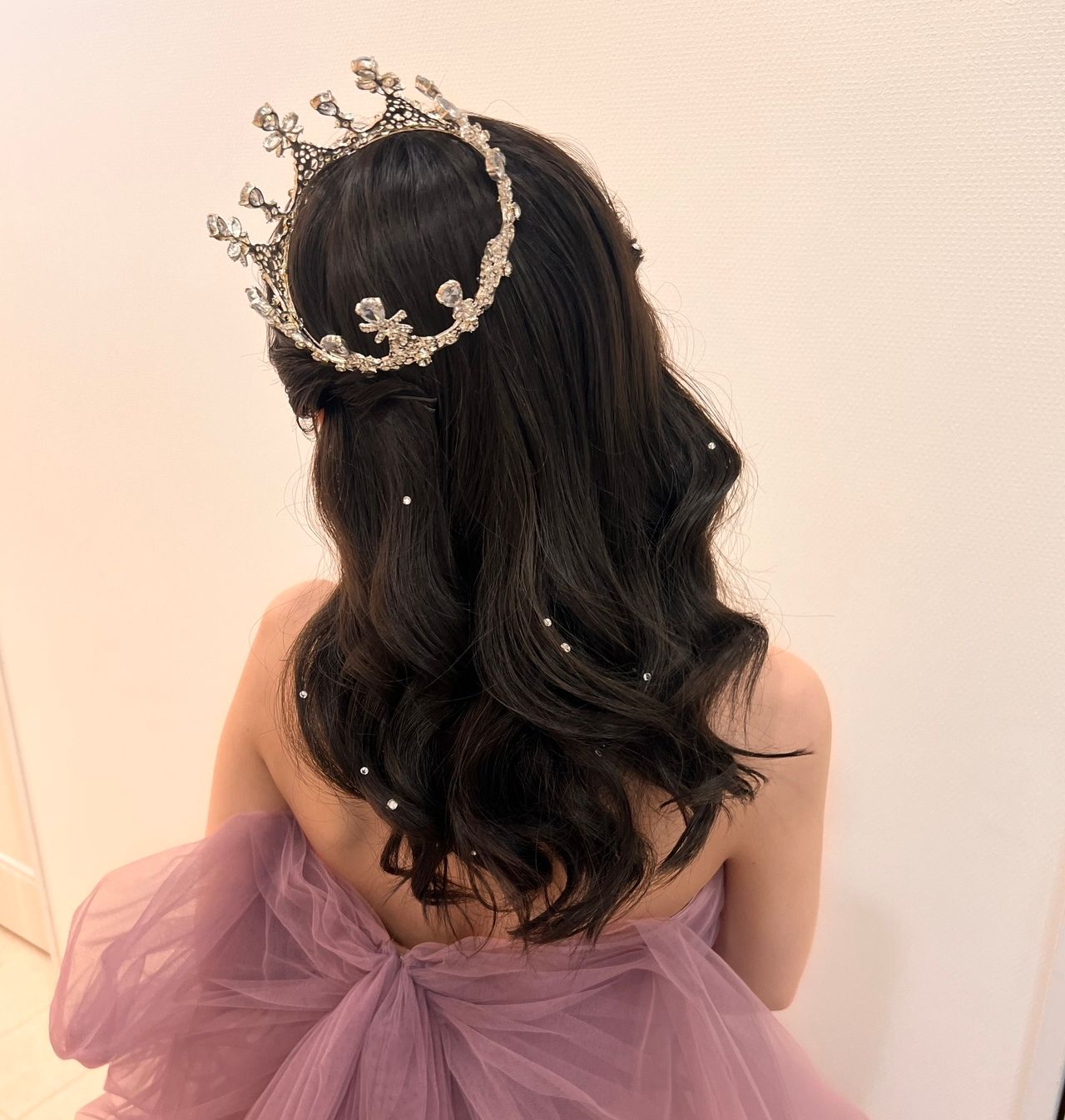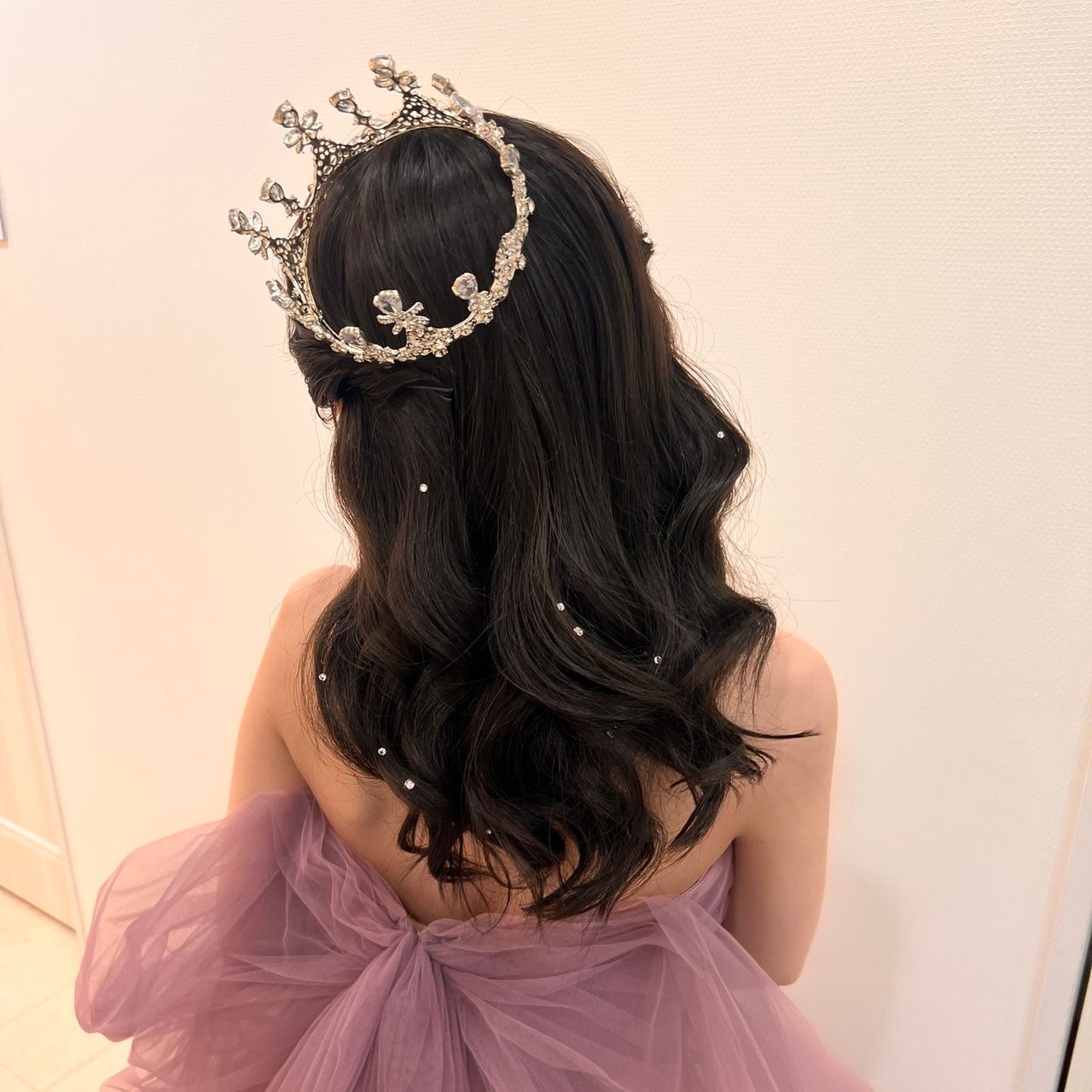 お色直しは、ダウンスタイルにしてクラウンをつけました!クラウンにもリボンのデザインがあり、考えとっても可愛かったです🎀🤍