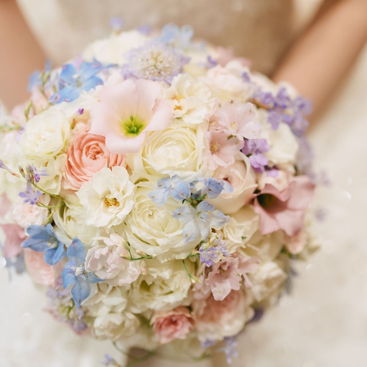 ベースを白と薄めのピンク、差し色で水色が入るようにしていただきました!また「百合や胡蝶蘭はイメージと違うため入れないでください」とお伝えしています。