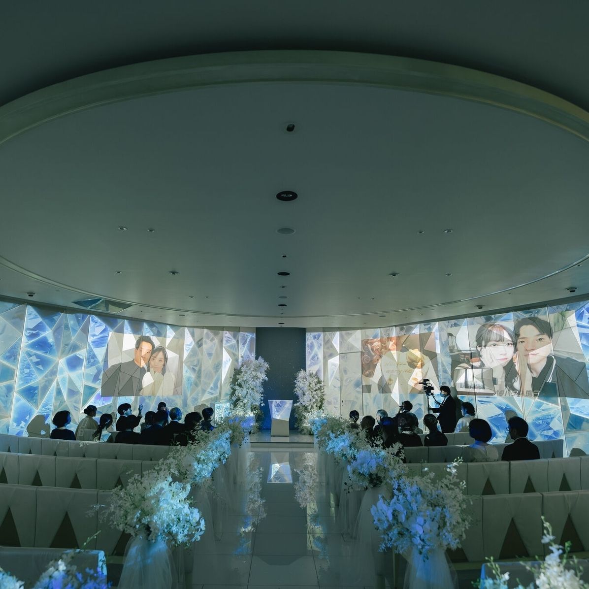当日はほぼ360度のプロジェクションマッピングも行っています!こちらは丸い形の挙式会場で窓がないことで行える演出だなと感じました🎶