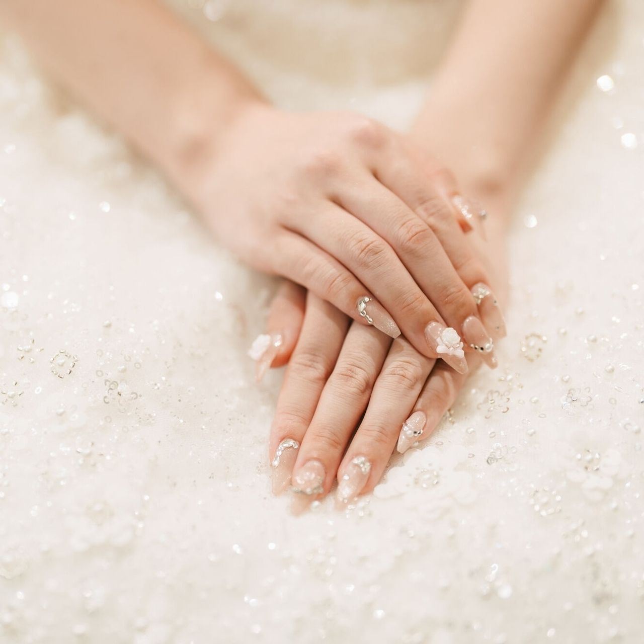 ネイルはピンクベースに、キラキラ、リボン、バラと自分の結婚式のイメージに合わせたデザインにしました🌹