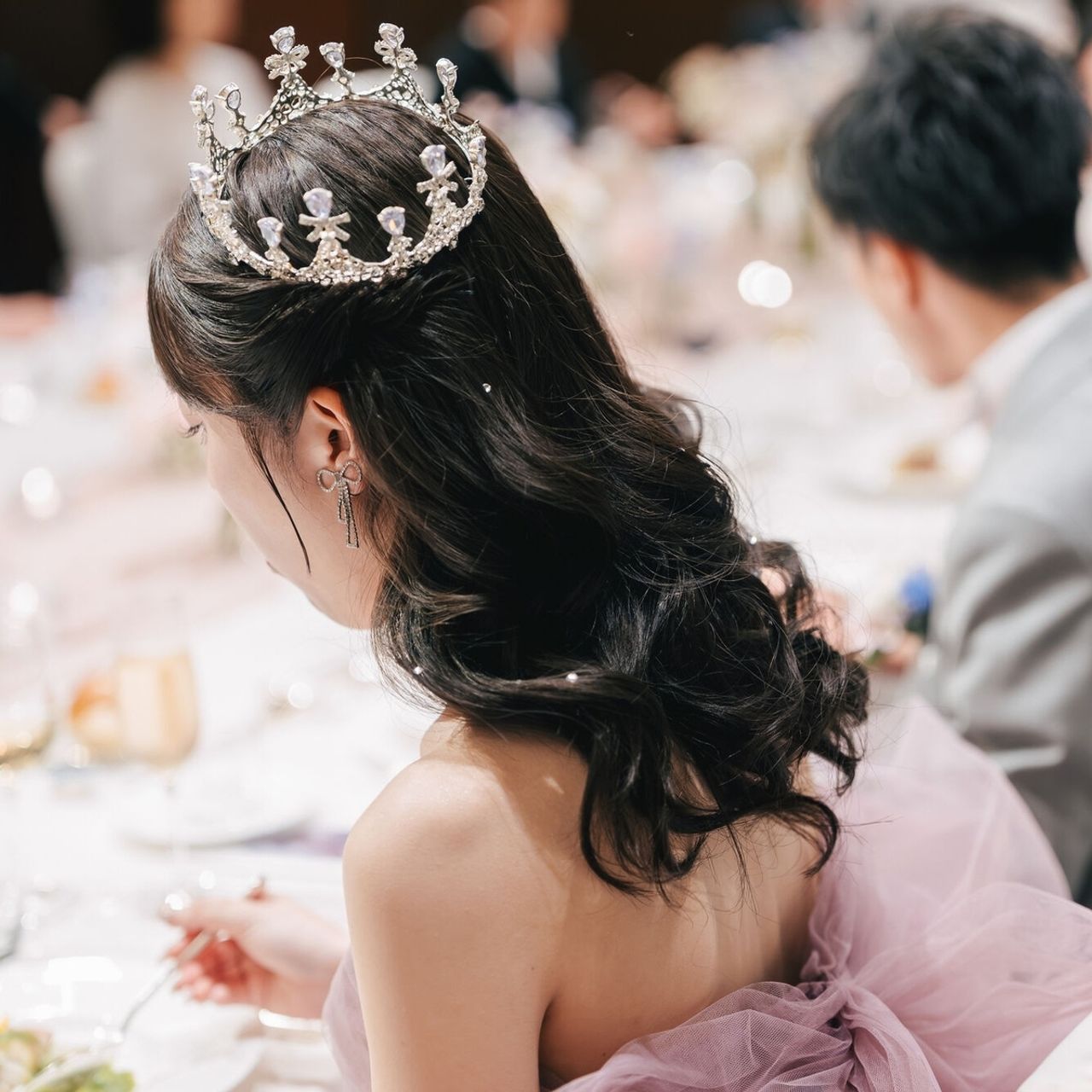 お色直しは、ダウンスタイルにしてクラウンをつけました!クラウンにもリボンのデザインがあり、とっても可愛かったです🎀🤍