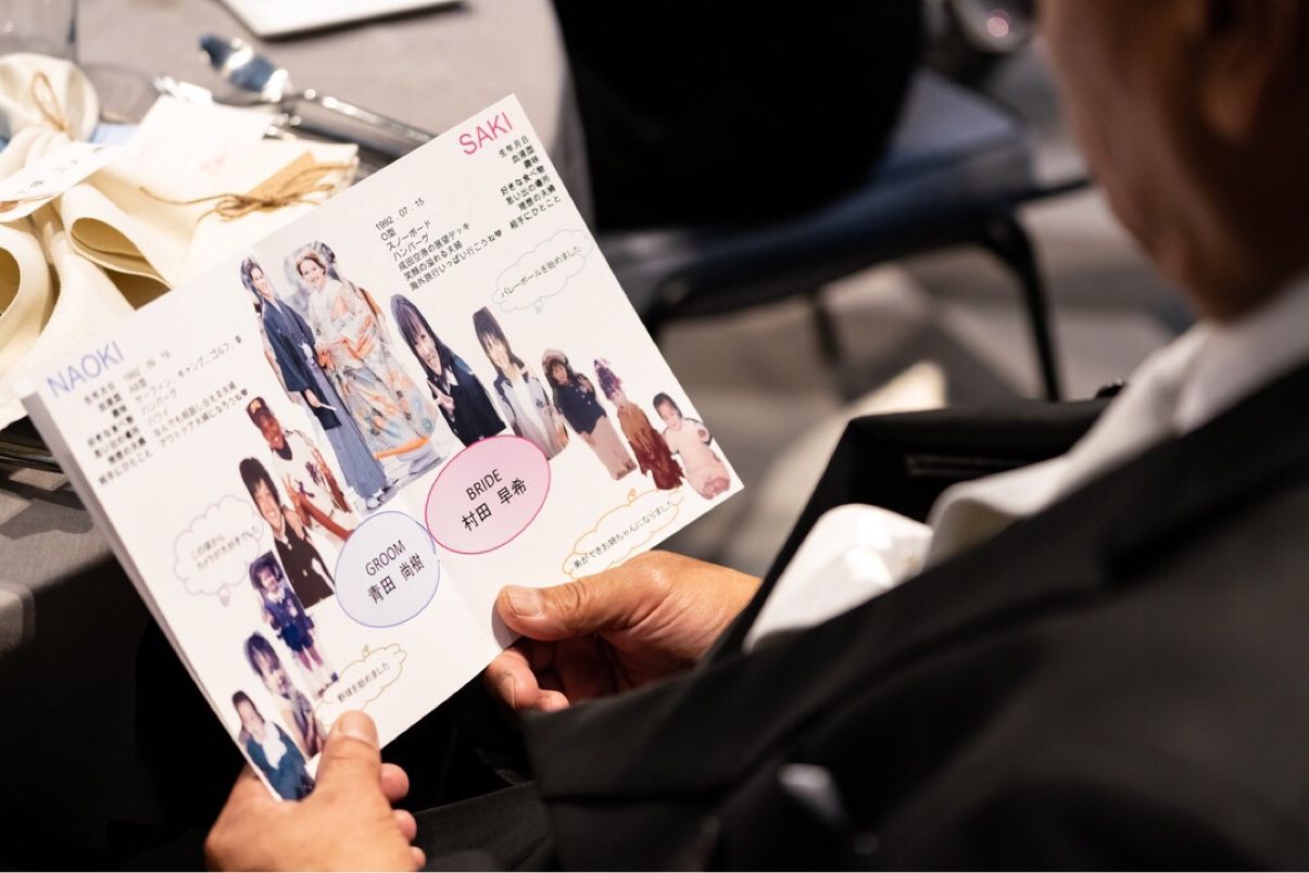 今まで披露宴に参列したときに暇な時間があったので、ゲストの方には、もっと私たちを知っていただけるようにと写真をたくさん取り入れた、プロフィールブックにするようにこだわりました!