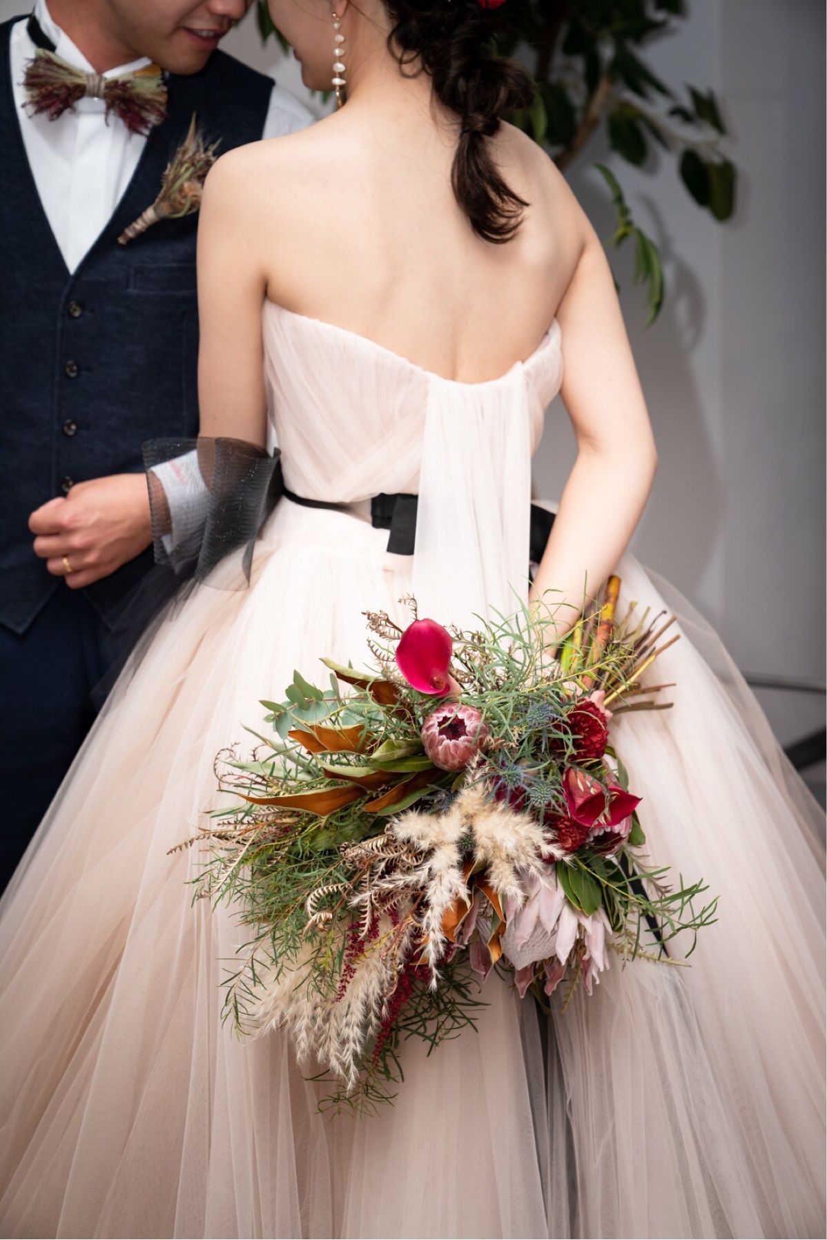披露宴は、カラードレスがベージュで、ブーケを映えさせたかったので 、えんじ色よりの赤をメインに作っていただきました。