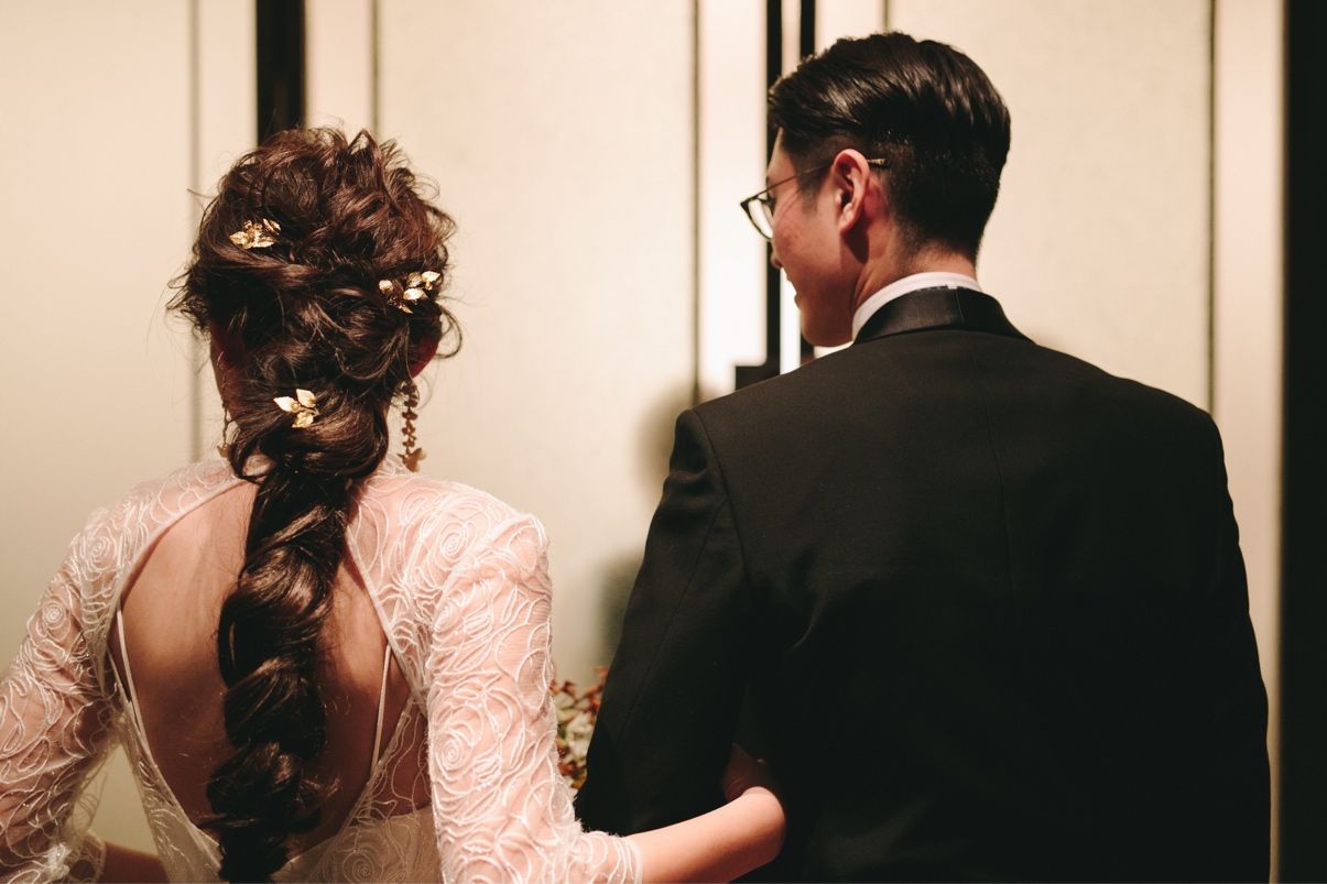 挙式時はクラシカルな雰囲気にしたかったので、ピタっとしたまとめ髪、披露宴入場時はふわふわヘア、お色直し時は編みおろしにしました。