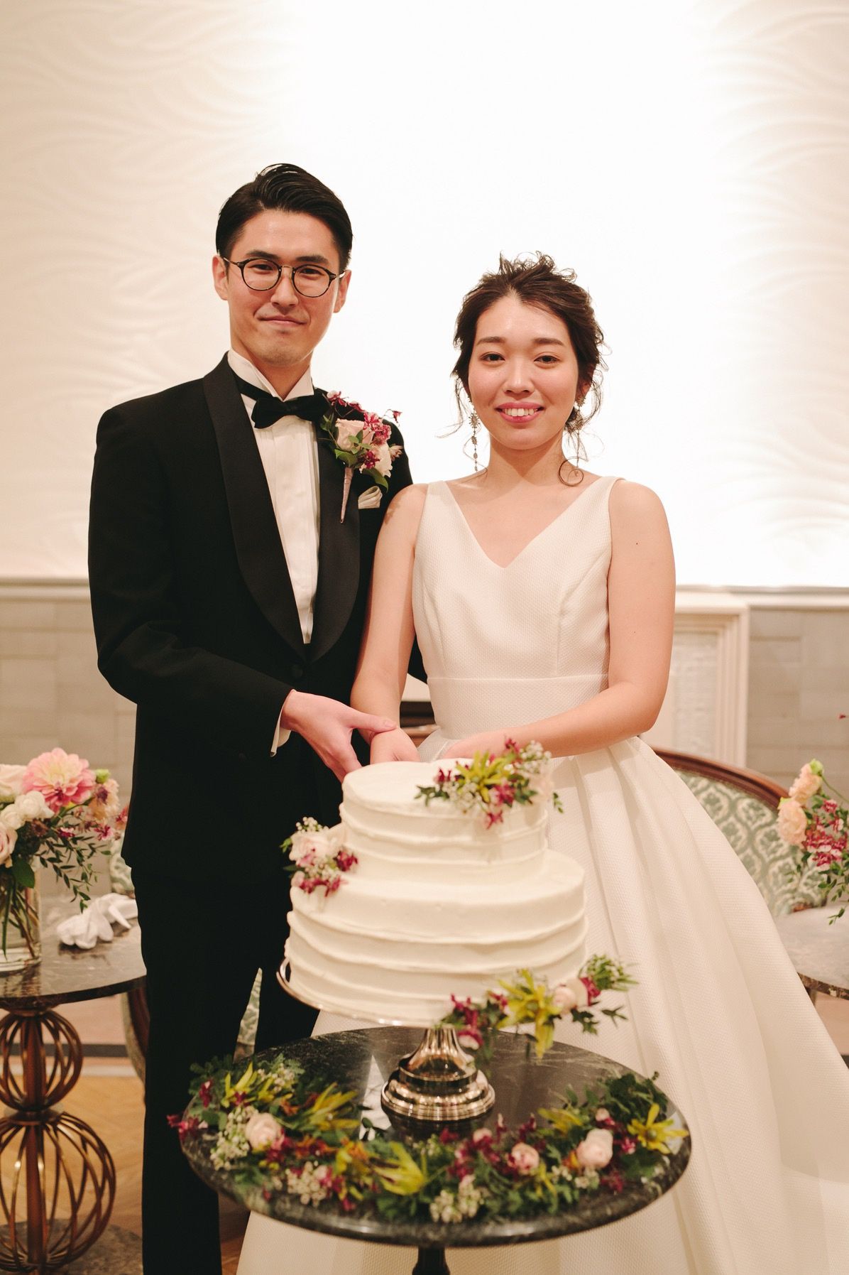 二段のウェディングケーキにお花を飾り、シンプルな雰囲気にしました。
