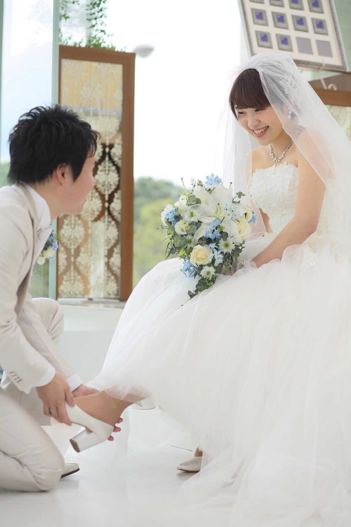 挙式会場は当日曇りでしたが、天井からの光でキラキラ輝いた空間と床が透明感溢れていて、明るく照らしてくれてとても綺麗でした。