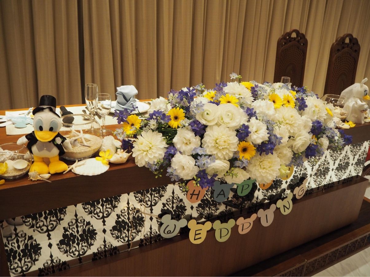 メインテーブルには、ドレスの色やテーマと合わせたガーベラやダリアのお花で青や白を中心に揃えてもらいました。ゲストに楽しんでいただけるよう隠れミッキーも取り入れました。その周りにはドナルドとデイジーのぬいぐるみ、貝殻、ビー玉などを取り入れました。