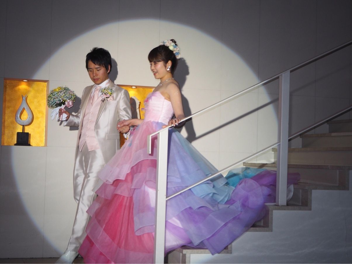 再入場では、もっと落ち着いてゆっくりと階段を降りれば曲に合わせられたなと思いました。再入場は、旦那さんに花束を持ってもらい階段の中央で渡してくれるような演出にすればよかったかなと思っています。