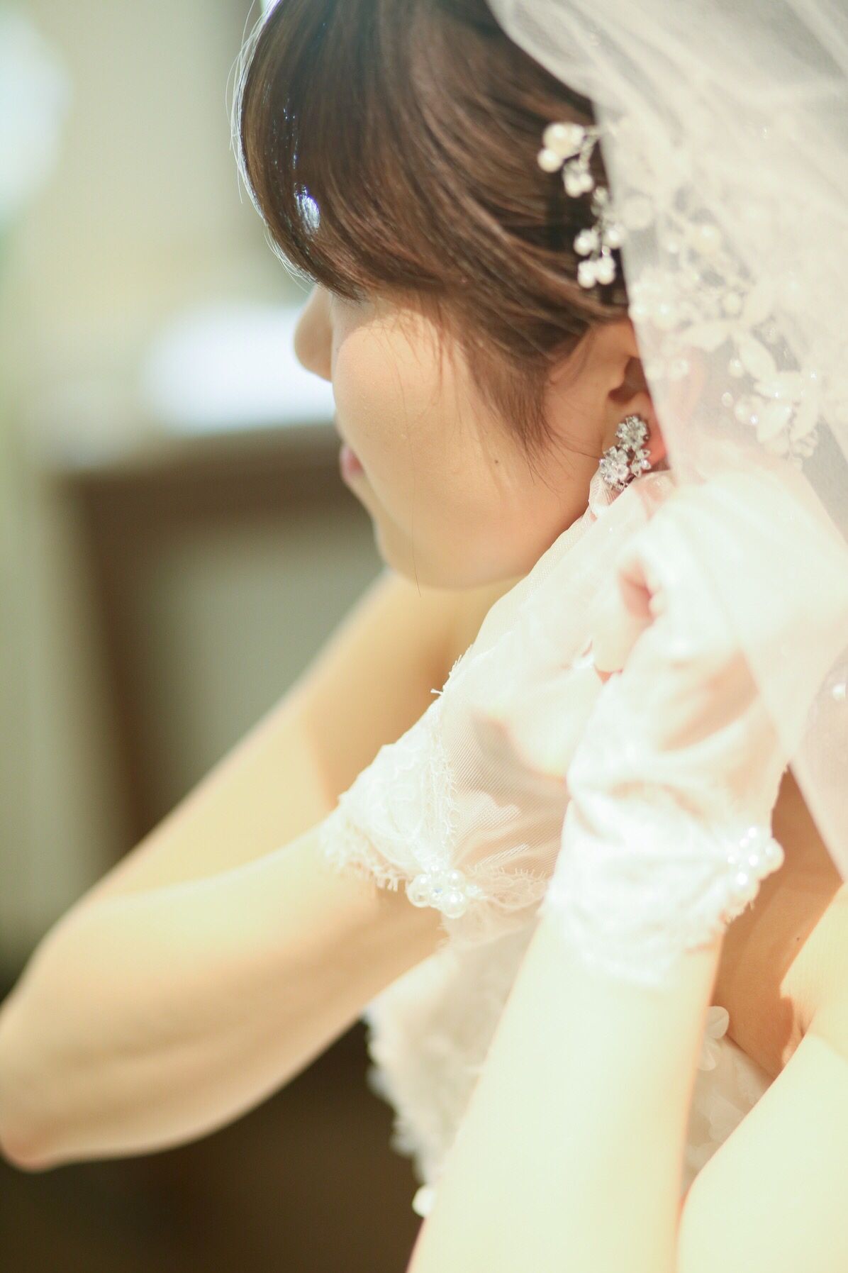 ウェディングドレスに合わせて、花と葉っぱのイヤリングとネックレスにしました。