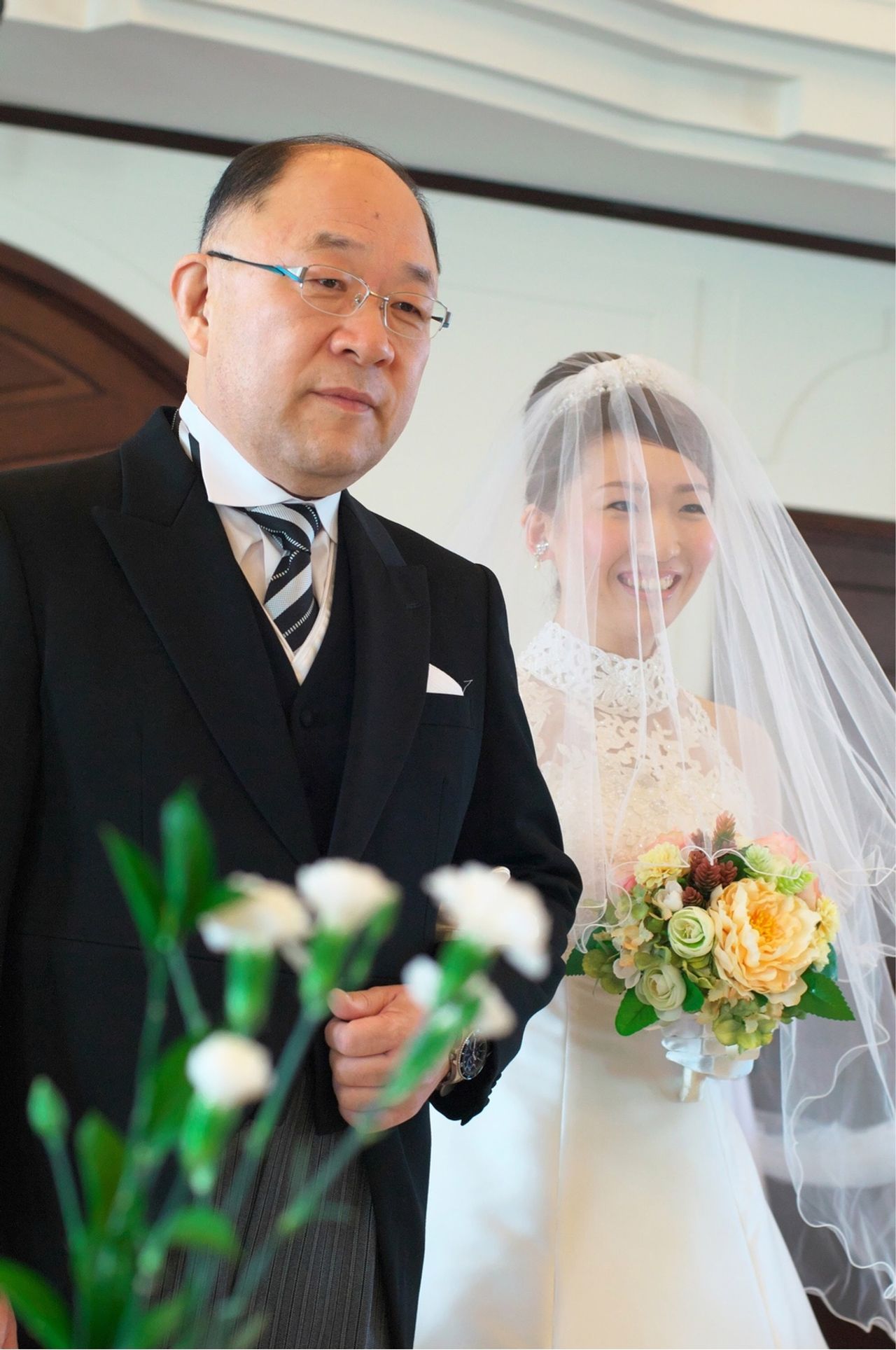 父とバージンロードを歩いたこと。母にベールダウンをしてもらい、父と腕を組んで、たくさんの大切な人たちと目を会わせながら新郎のもとまで歩いている瞬間が、自分の今までの人生をぎゅっと凝縮した時間のように思えて、幸せな気持ちが込み上げてきました。