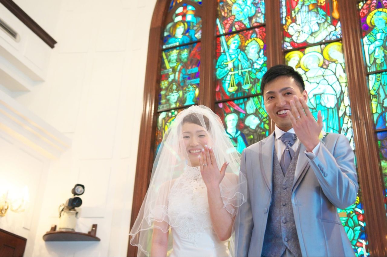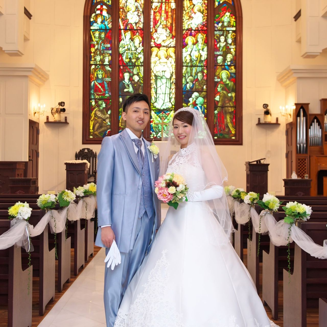 式場選びの決め手の一つとなったのが、大きなステンドグラス!イギリスで1910年前後に制作されたといわれる歴史深いもので、一見の価値ありです。