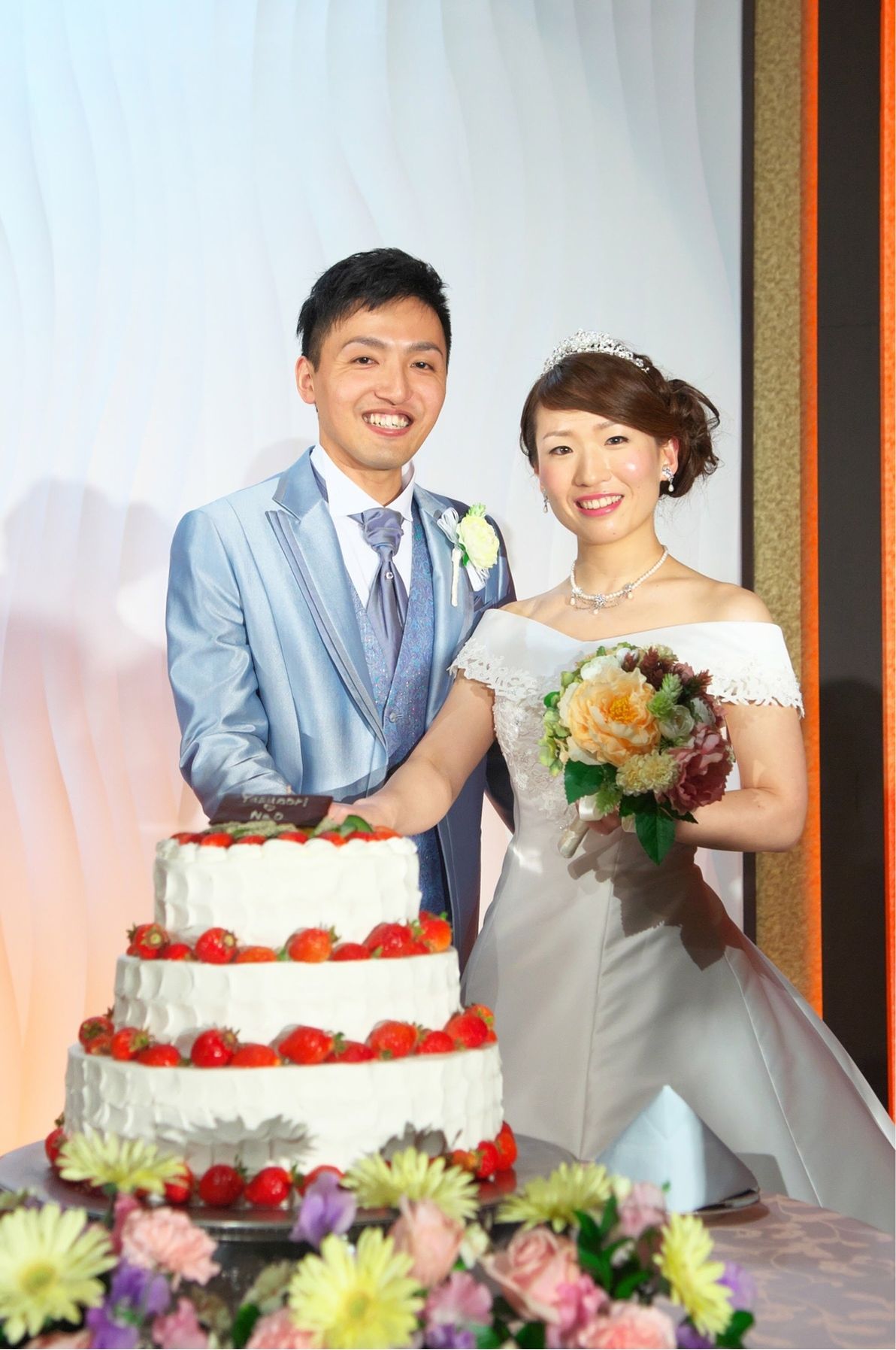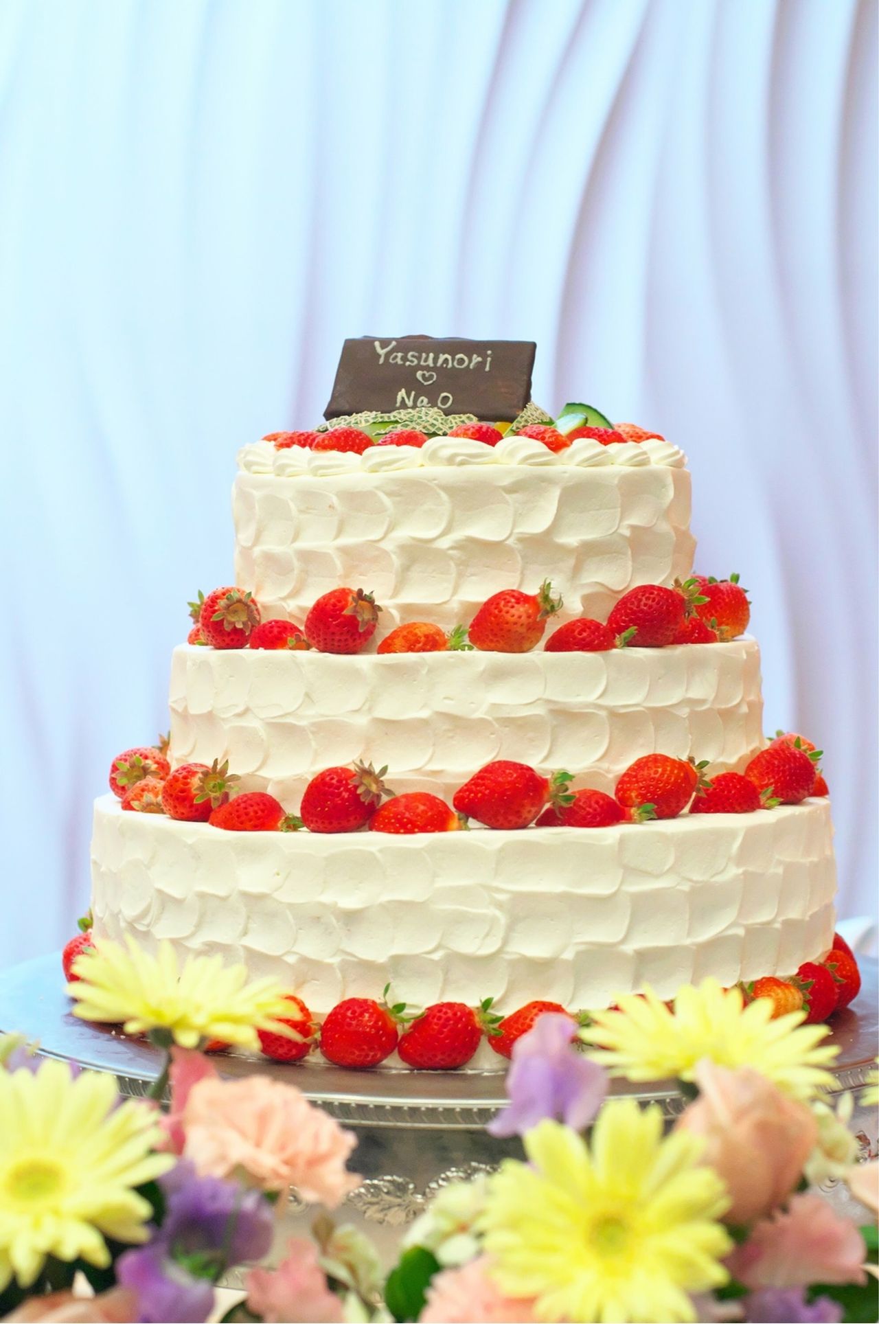会場が広かったため、高さのあるウェディングケーキにしました。新郎が大好きなイチゴをたくさんトッピングしてもらいました。