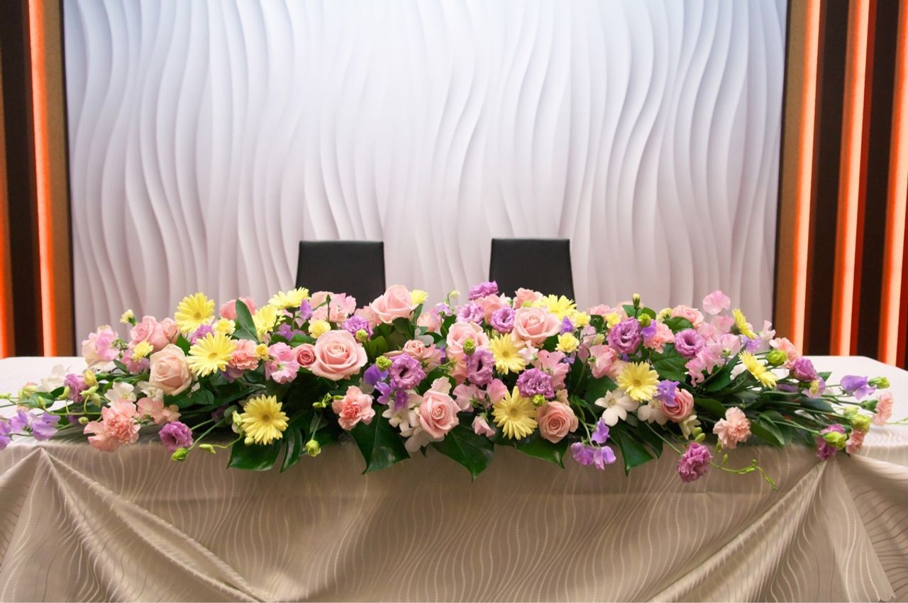 高砂装花は春らしいパステルカラーで優しい雰囲気に。ゲストテーブル装花はビビッドピンクでとびきり可愛くオーダーしました。どちらもバラの花を入れてもらいました。