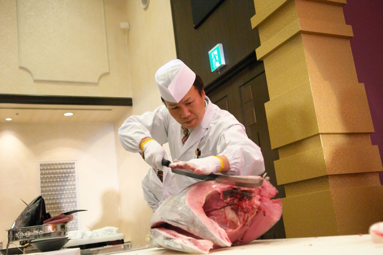 サプライズでマグロの解体ショーを行いました!ホテルの強みを生かした一風変わった演出が出来るところがおすすめポイントです。