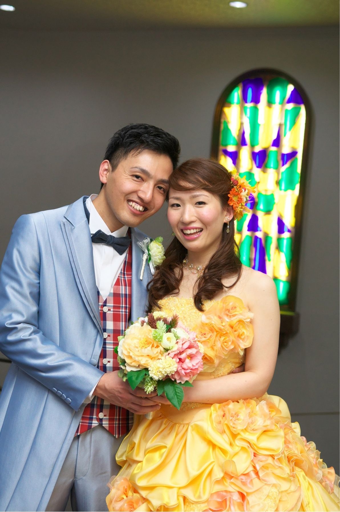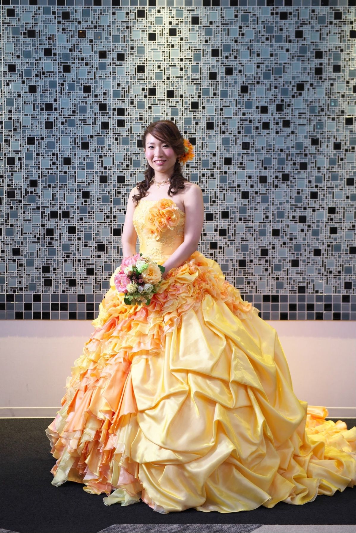 「美女と野獣」をテーマにしていたので、カクテルドレスはイエローを選びました。ウェディングドレスがすっきりとしたデザインだったので、カクテルドレスはボリュームのあるデザインにしました。