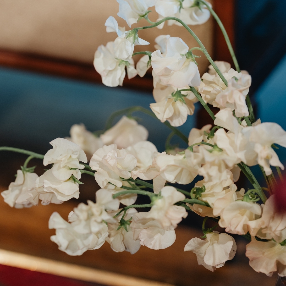 plantscollectionさんで、ぴょんぴょん抜け感のあるイメージで、温かい色味と白を使用した装花をお願いしました。こだわりがなかったので、季節の花を使用して大方おまかせでお願いしています。