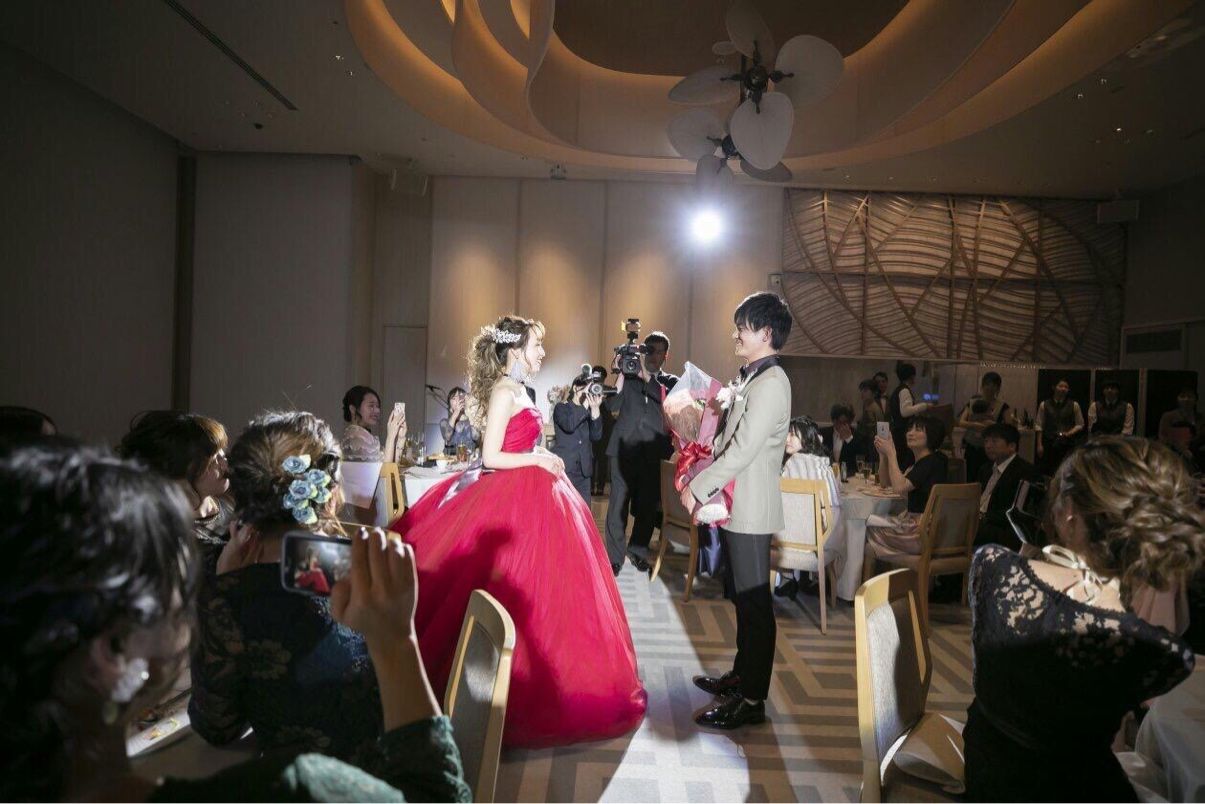 披露宴中に、新郎からサプライズで動画と薔薇の花束を渡されるシーンで。完全にサプライズで全く知りませんでした。 びっくりしてうるうるときました。