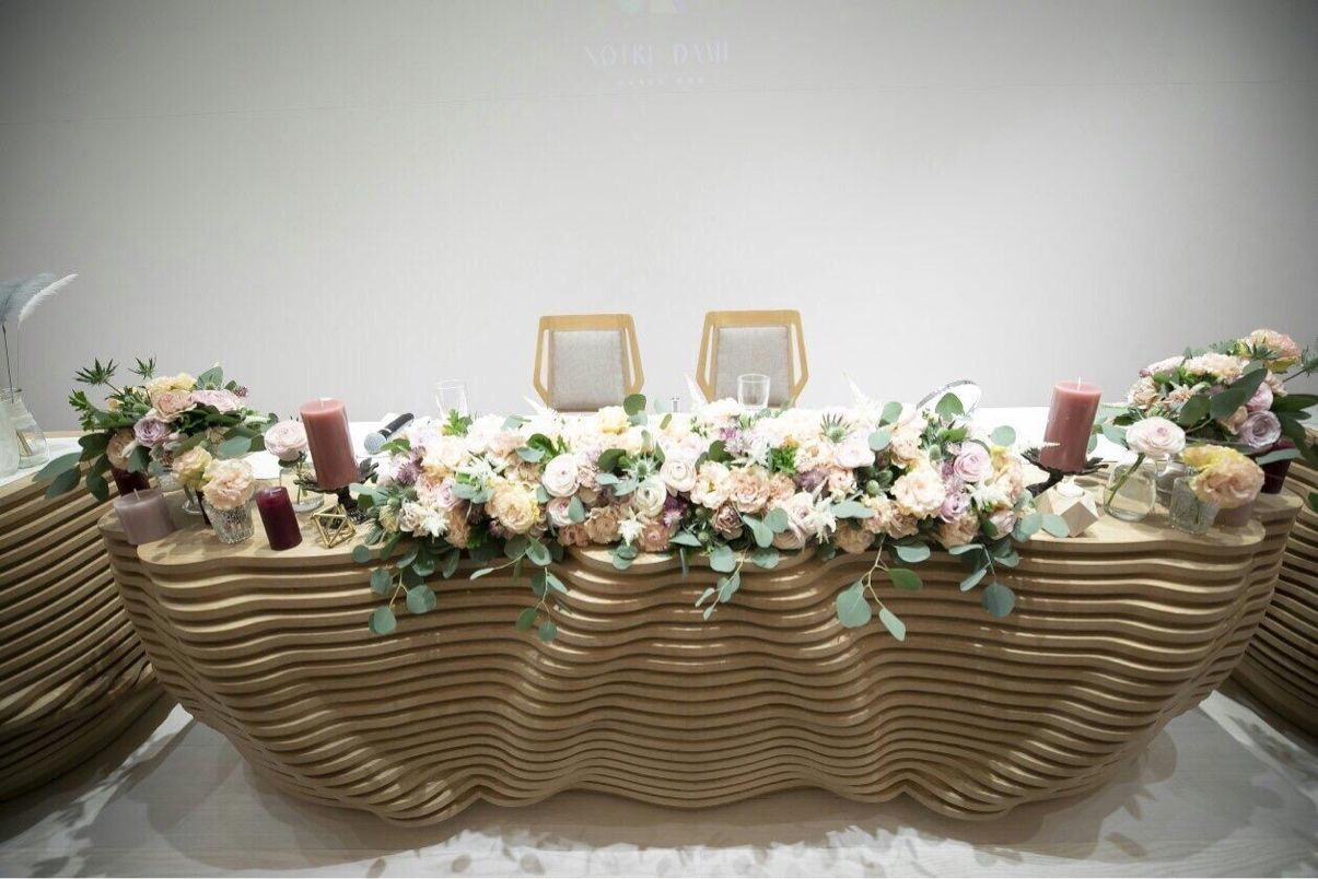 ピンクを基調に、暖色のくすみカラーをグリーンを混ぜながらまとめてもらいました。高砂は、カシスカラーのキャンドルなども置き、大人可愛い空間に。