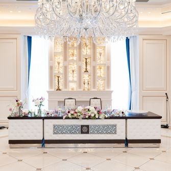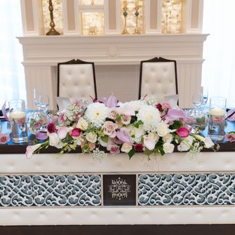テーマは『大人っぽく、エレガントな結婚式』です。上品で華やかな雰囲気を演出するため、白を基調とした会場にブルーのテーブルクロスを合わせたのがポイントです。お花やドレス、アクセサリーもエレガントさを意識しつつ、プリンセスになれるように…という想いで選びました。