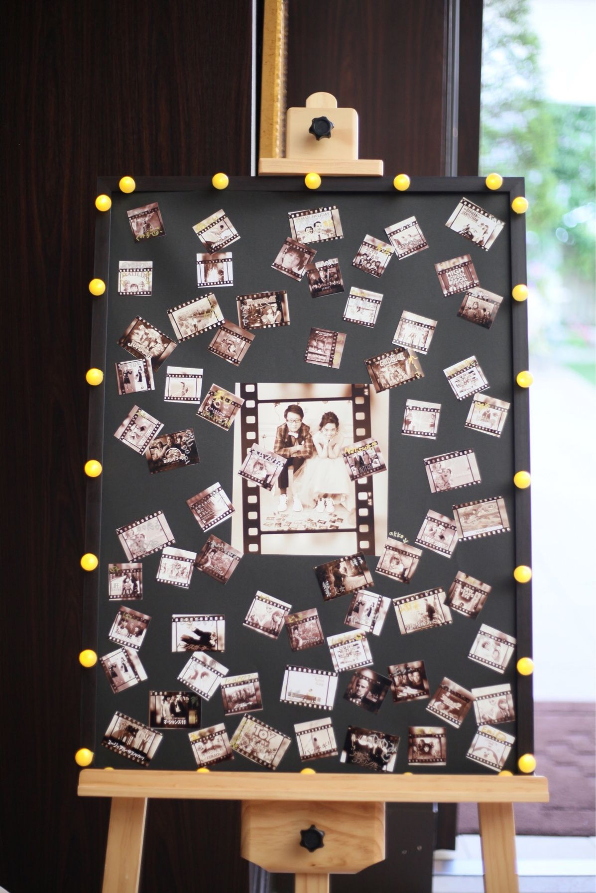 結婚式のテーマを映画にしていたのですが、せっかくならゲストも参加型のイベントにしたいと思い、事前に招待状の返信ハガキで、おススメの映画を聞きました。それを当日配るプロフィールブックに載せたり、ウェルカムサインボードにのせたり、BGMに映画の曲を使いました!ゲストの皆さんからは「すごーい!ここに使われたんだね」とか「映画に年代を感じて面白い」と言って喜んでもらえました。