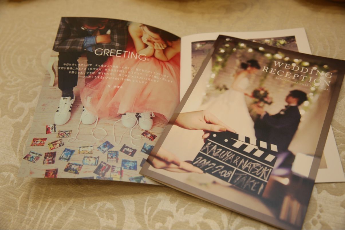 招待状、席札、テーブルナンバーなどのペーパーアイテムは全て手作りし、席次表、メニュー表などは分けずにプロフィールブック1冊にまとめることで、節約しました!