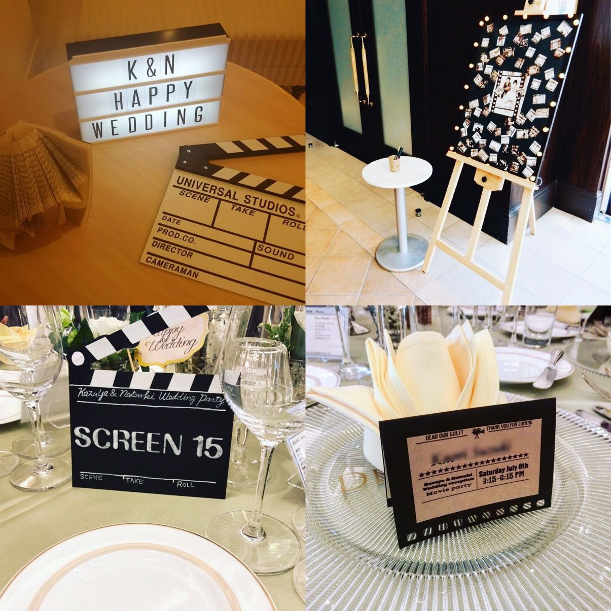 招待状の返信ハガキに「新郎新婦にオススメする映画を書いてください♪」とお願いし、ゲストのおススメ映画をプロフィールブックに載せたり、ウェルカムスペースのサインボードに飾ったり、当日のBGMにも映画の曲を使用しました♪