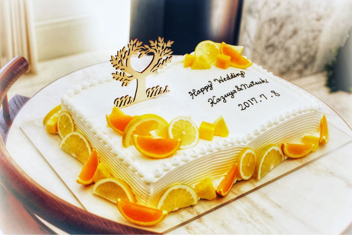 新郎の趣味が読書だったのでそれにちなんで本の形のケーキにしました。夏婚なので爽やかなイエローの果物を使ったケーキにしました。