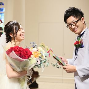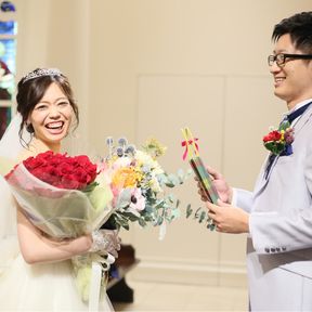 挙式は厳かな雰囲気で行いたいと考えていましたが、披露宴はとにかくゲストに楽しんでほしいというのがあったので、アットホームな雰囲気になるようにソファー高砂のできる会場を選んだり、お互いが一緒にいることなく、バラバラで過ごしたり、ゲストと一緒に過ごす時間も大切にしました**