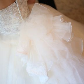 挙式は手作りのティアラ、披露宴はビジュのヘッドアクセサリーを付ける予定だったのでどちらにも合うように、ビーズの刺繍がキラキラと光るキレイなドレスを選びました!