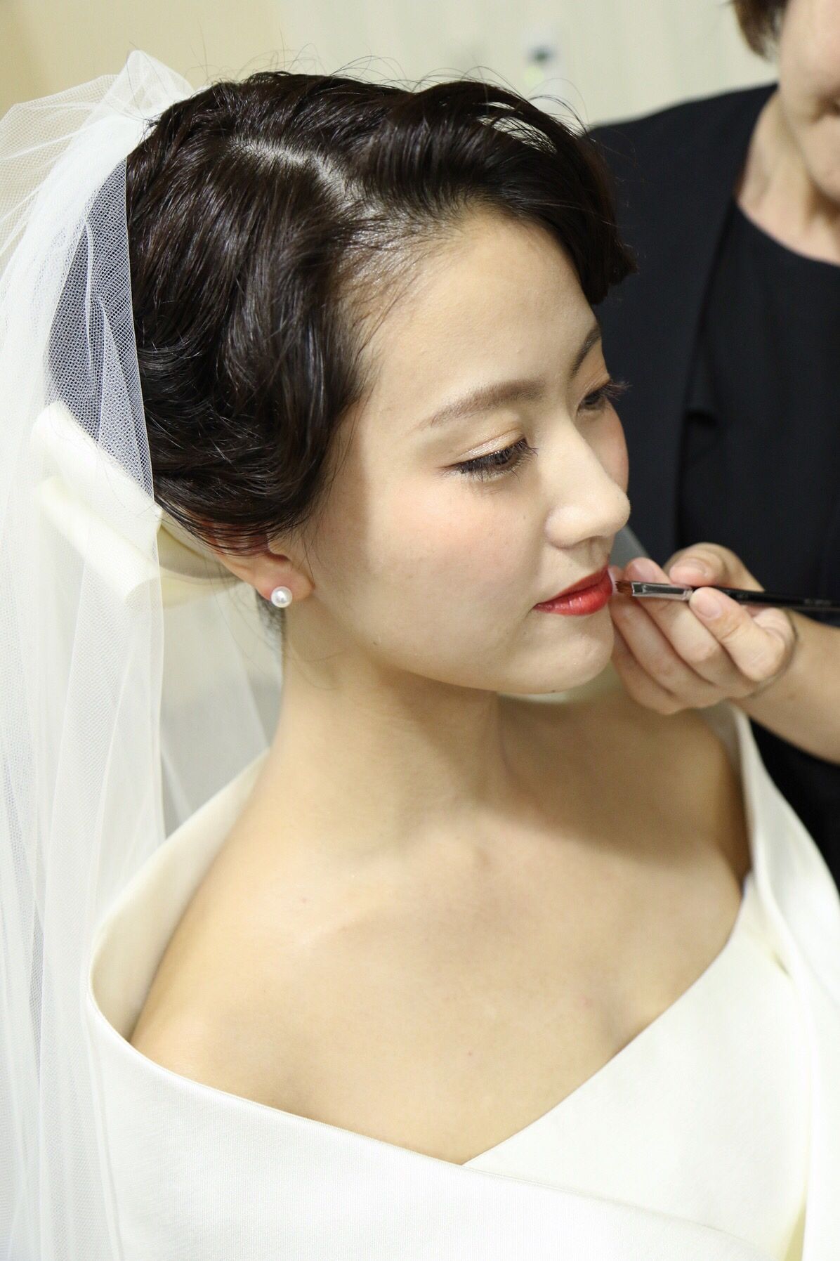 前撮り、挙式、披露宴中座前まではドレスに合わせたクラシカルなヘアメイクをしました。20世紀初頭に流行ったフィンガーウェーブスタイルです。口紅もかなり重たい赤にして、あまりいないヘアメイクを目指しました。 披露宴中座後は、可愛らしくするために髪を下ろして横にゆるく流しました。メイクも甘めに。