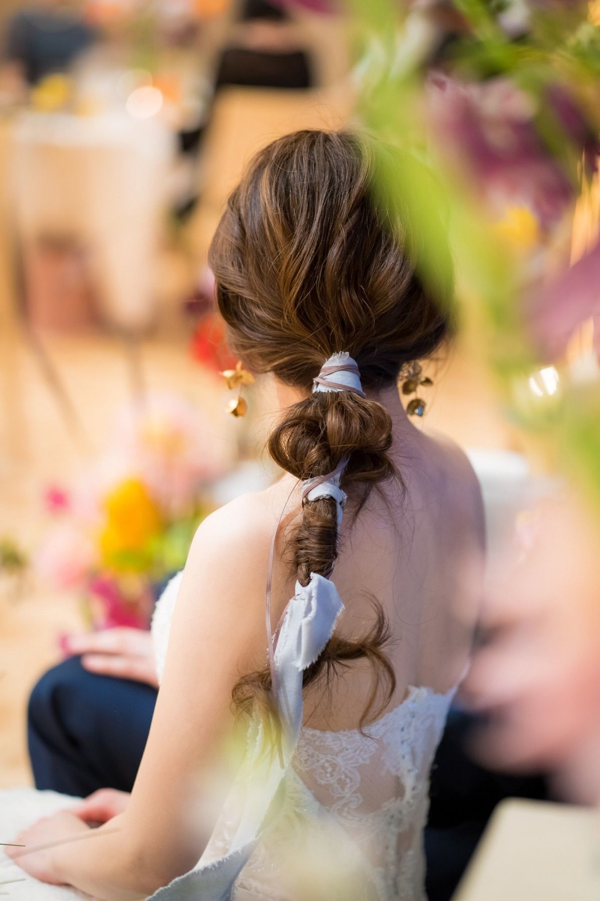 編みおろしに玉ねぎヘアー&フィガーエイトという遊び心のあるアレンジを加えた一癖あるスタイルにしました