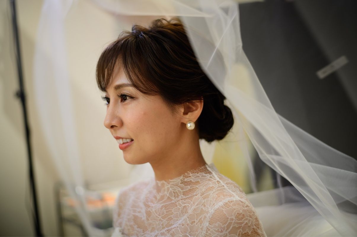 挙式ではレースブラウスを着用することで露出を抑え、アクセサリーも最小限に。