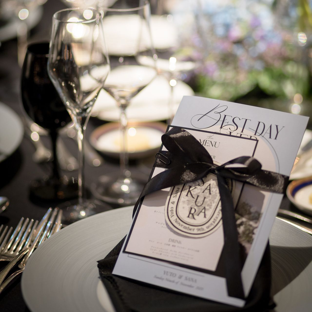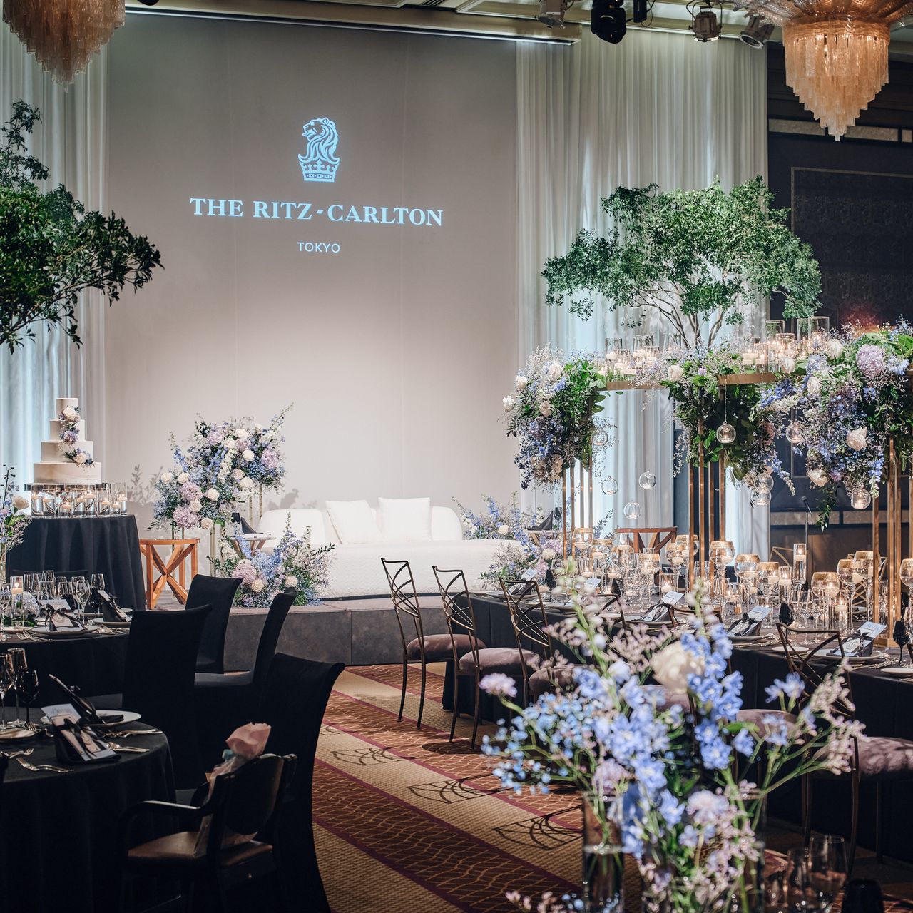 ドレスコードの【パープル&ブルー】をさりげなく取り入れたり、ザ・リッツ・カールトン東京のチャペルのスワロフスキーに似せたデザインにしていただきました。