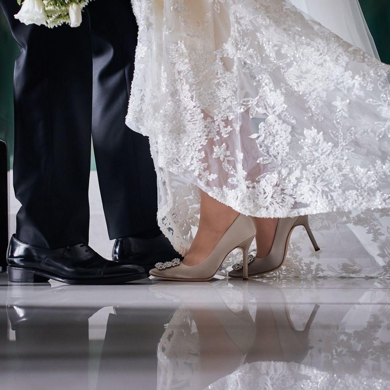 ウェディングドレスは裾を引き上げて歩く必要があり常に足元が見えるのと、ヒールが高いほどドレスを美しく着こなせるとアドバイスをいただき、hangisiの10.5cmヒールにしました。