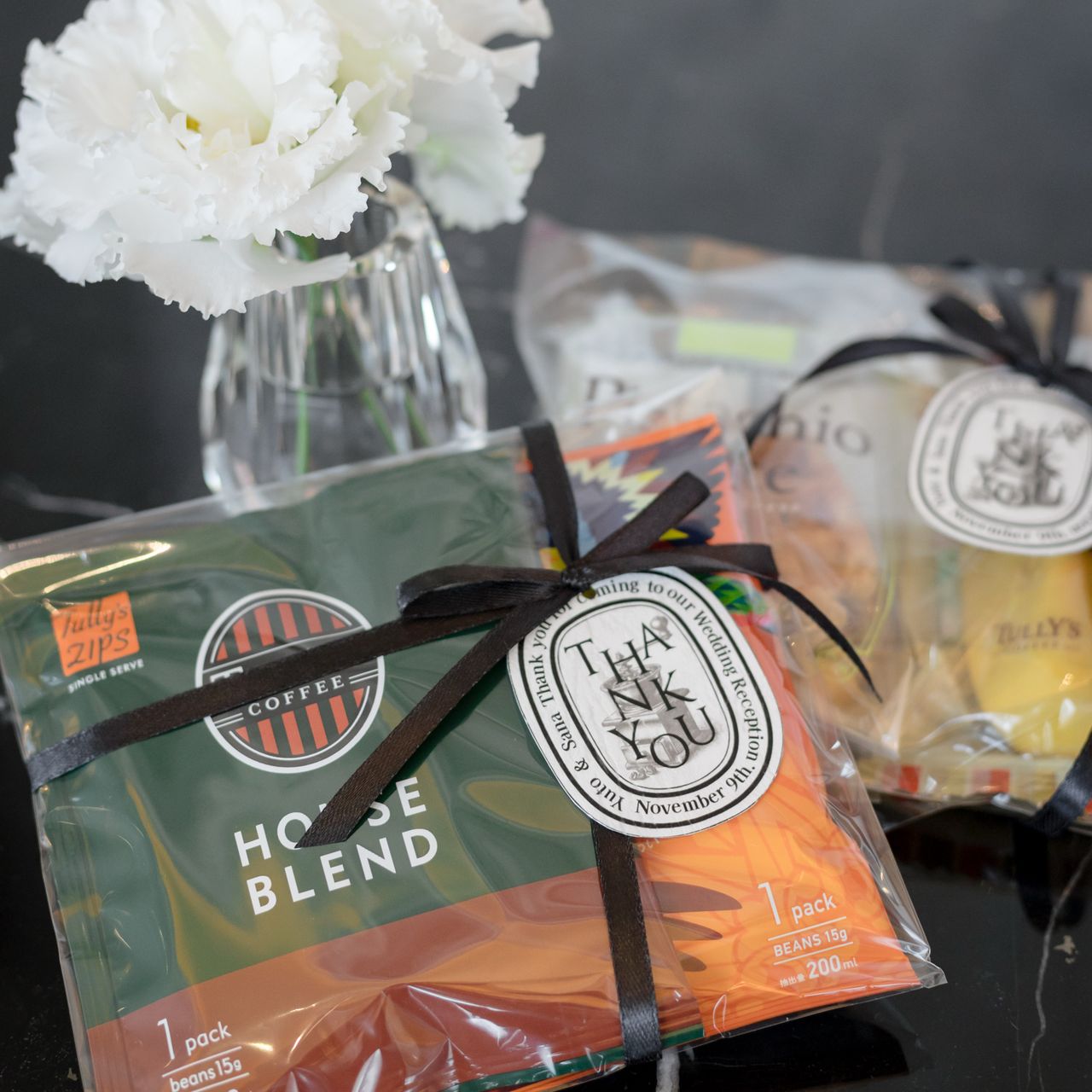 DIPTYQUE風のThank Youタグを自作し、ブラックリボンでラッピングしました。