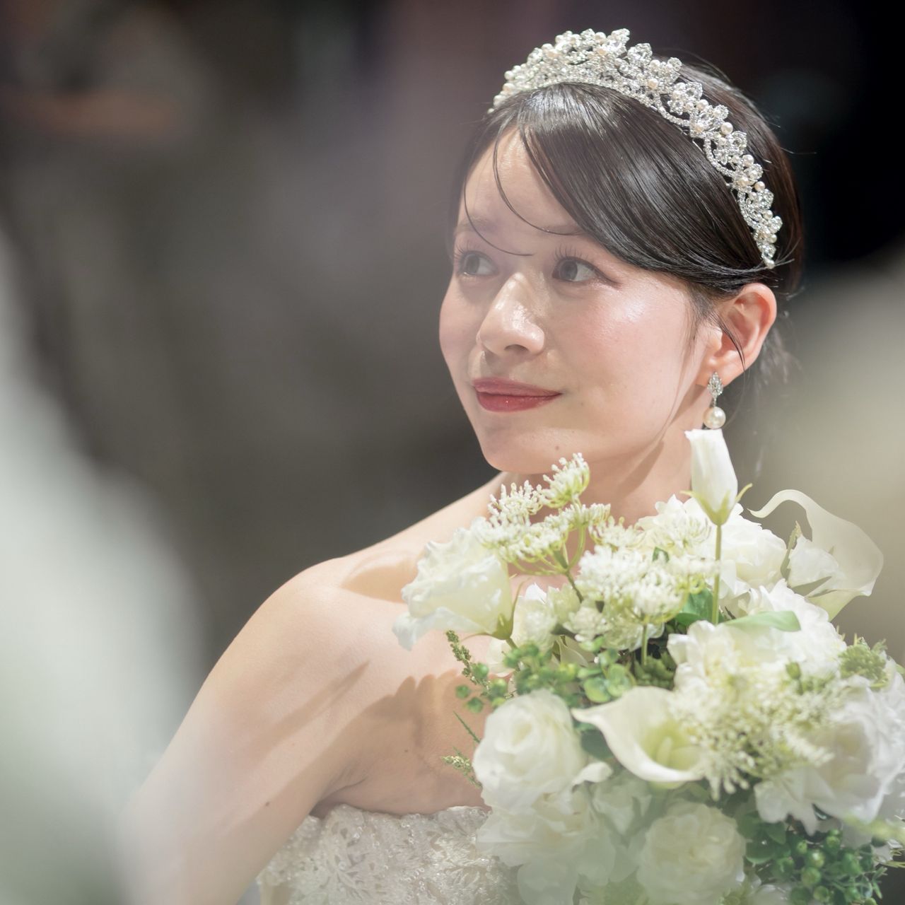 ティアラを引き立たせるため、ティアラと同じクリスタルとパールの控えめなデザインにしています。