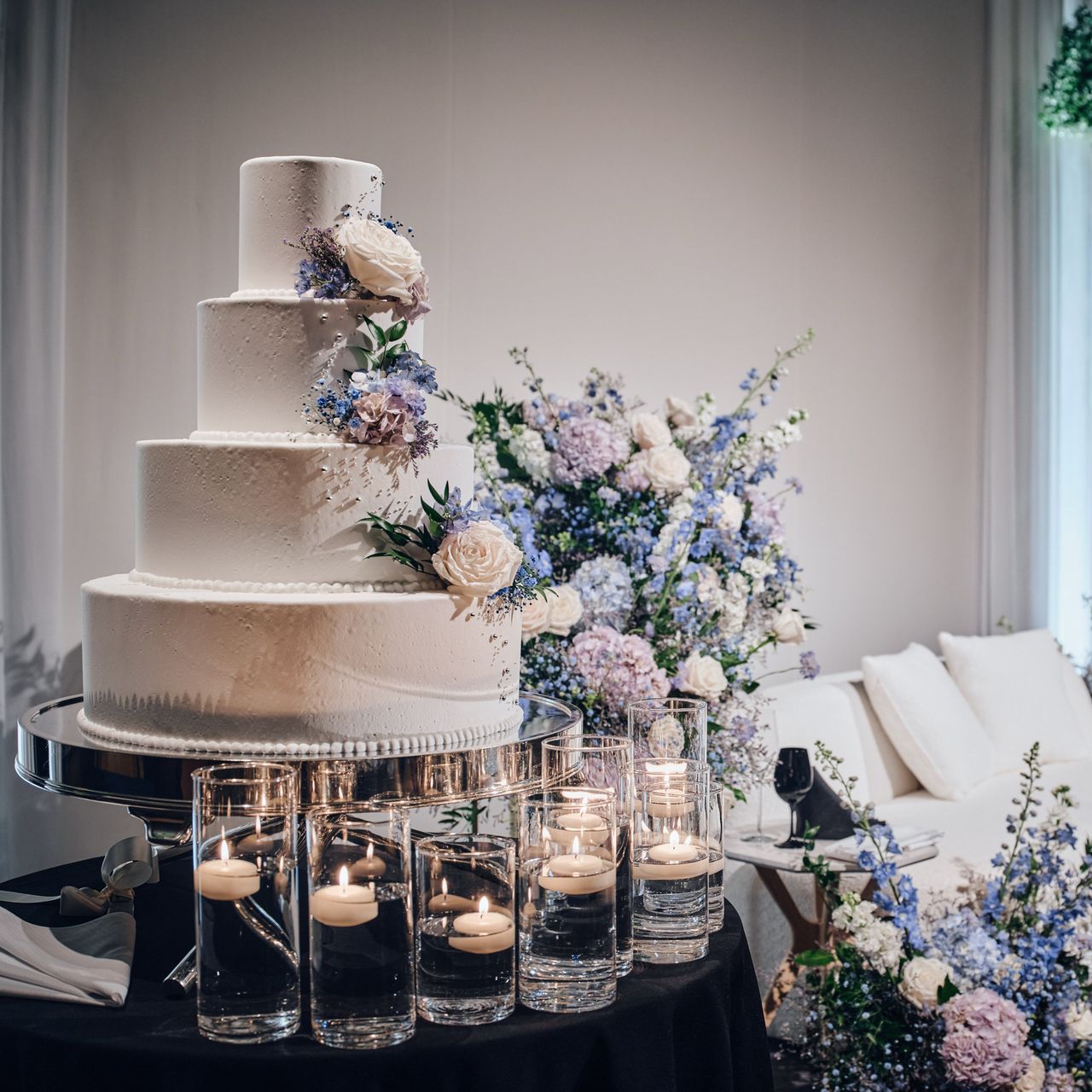 会場の雰囲気と合わせるためにイチゴ等のフルーツではなく、オプションでフラワーに変更しケーキの土台の足元が見えないようキャンドルで隠してもらっています。
