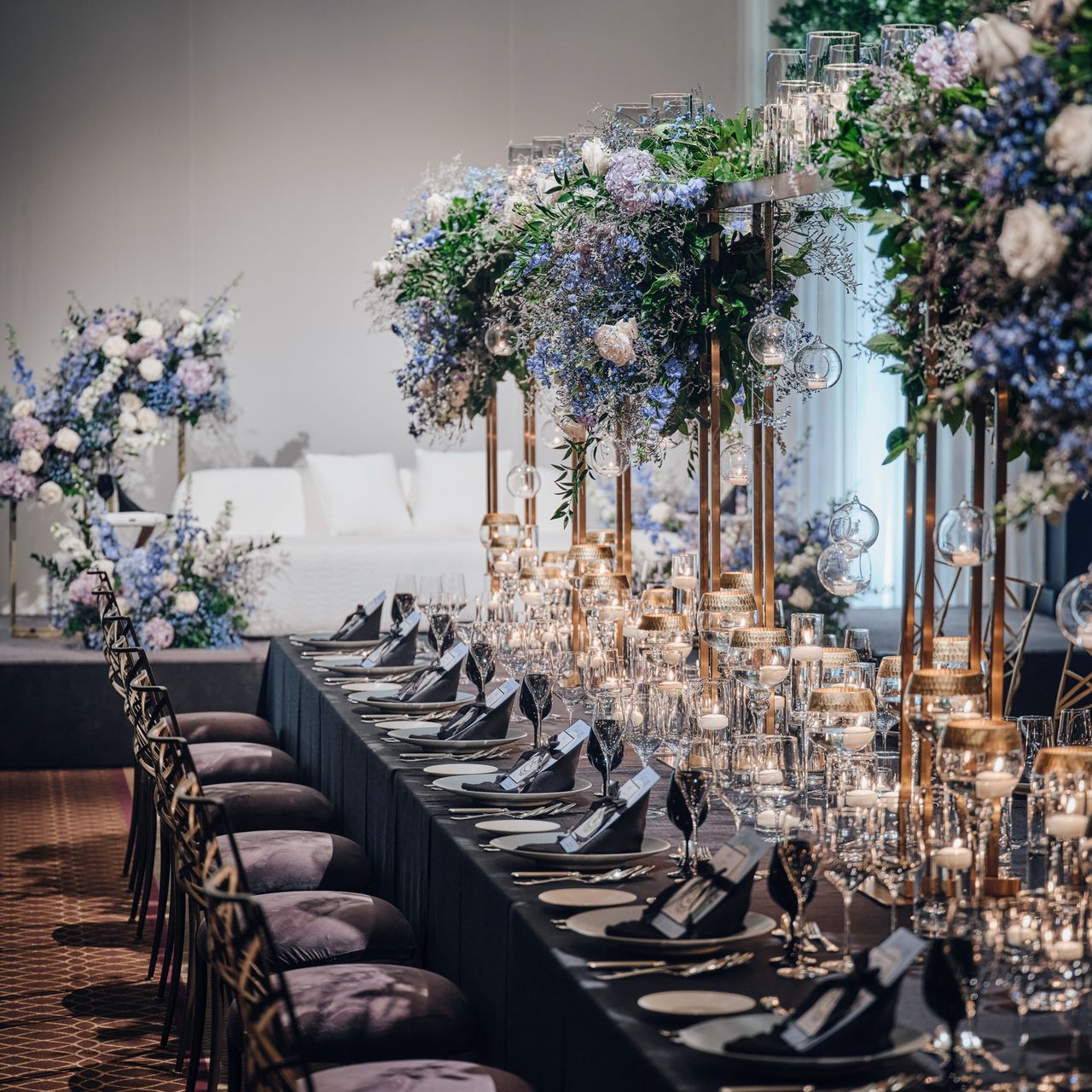 海外ウェディングのような動きのある装花にしたく、バラ・紫陽花・デルフィニウム等のブルー×パープルをメインに、イタリアンルスカスのグリーンでボリュームを出してもらいました。