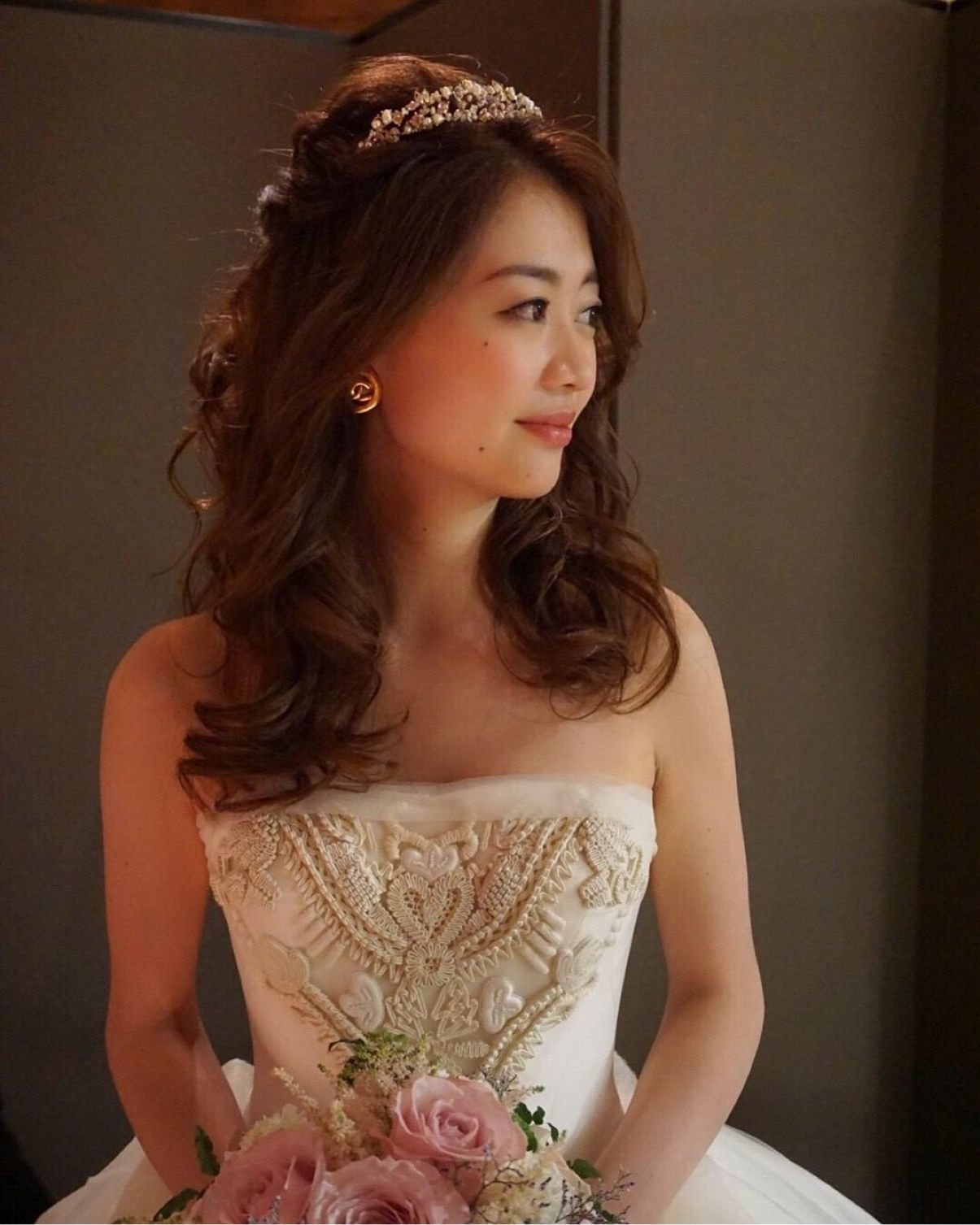 リーゼルのドレスを着る方が沢山いるので、少し個性を出そうと思い、ゴールドのアクセ(ピアス)を合わせました。