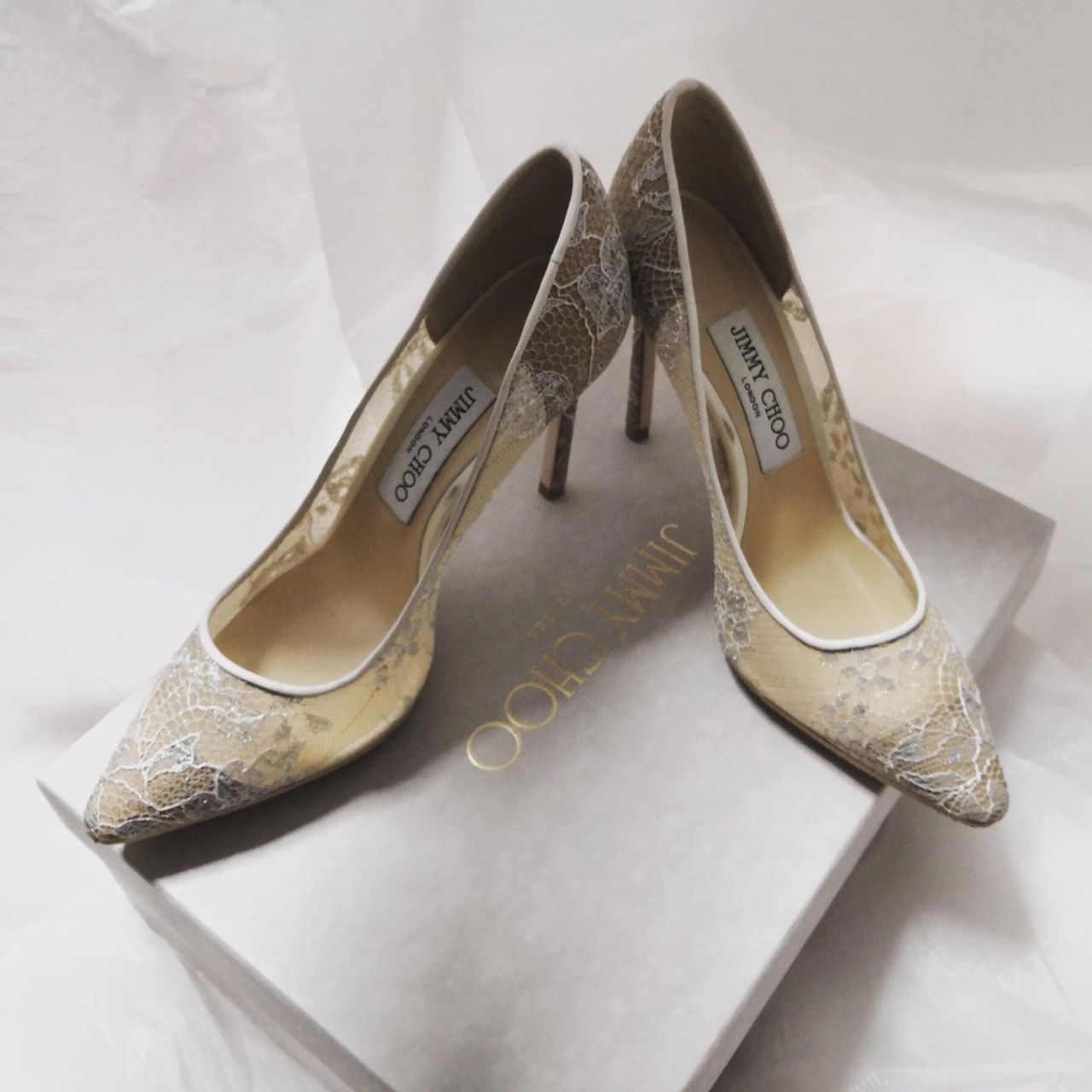 衣装担当の方から白かベージュの色味が良いとのアドバイスをいただき、JIMMY CHOOのROMY(レース素材のもの)にしました。普段履き慣れない10センチヒールでしたが、とても歩きやすかったです!