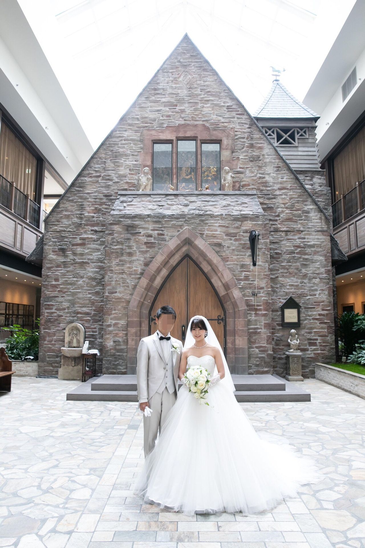 ・ガラス張りの天井から降り注ぐ日差しの中に佇む温かみのあるレンガ造りの屋内チャペルで、緑豊かな明るい雰囲気と天候に左右されないところが気に入りました。