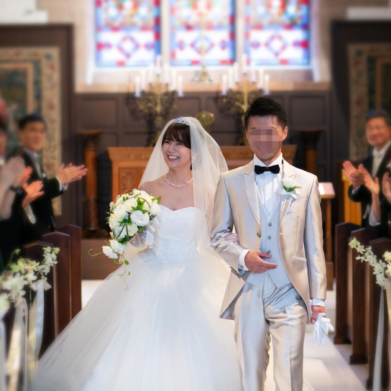 ・チャペル内は正面のステンドグラスが白いバージンロードに反射してとても綺麗です。親族席は縦に並んでおり、両家が向かい合って新郎新婦と近い距離で見守ってもらえる点も良かったです。