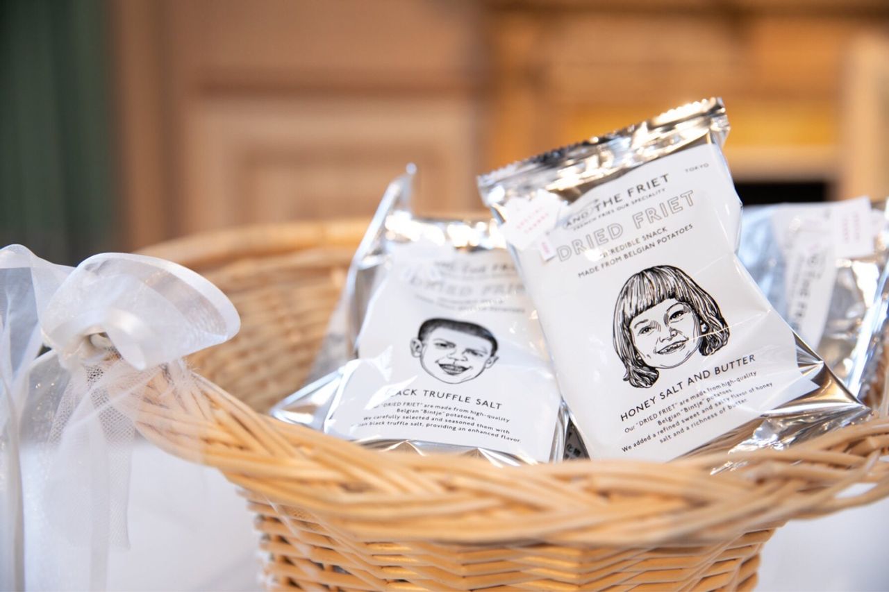 ●ビアサーブ時のおつまみとしてAND THE FRIETのスナック(ミンネでオーダーした名前入りサンキューシールを貼りました)