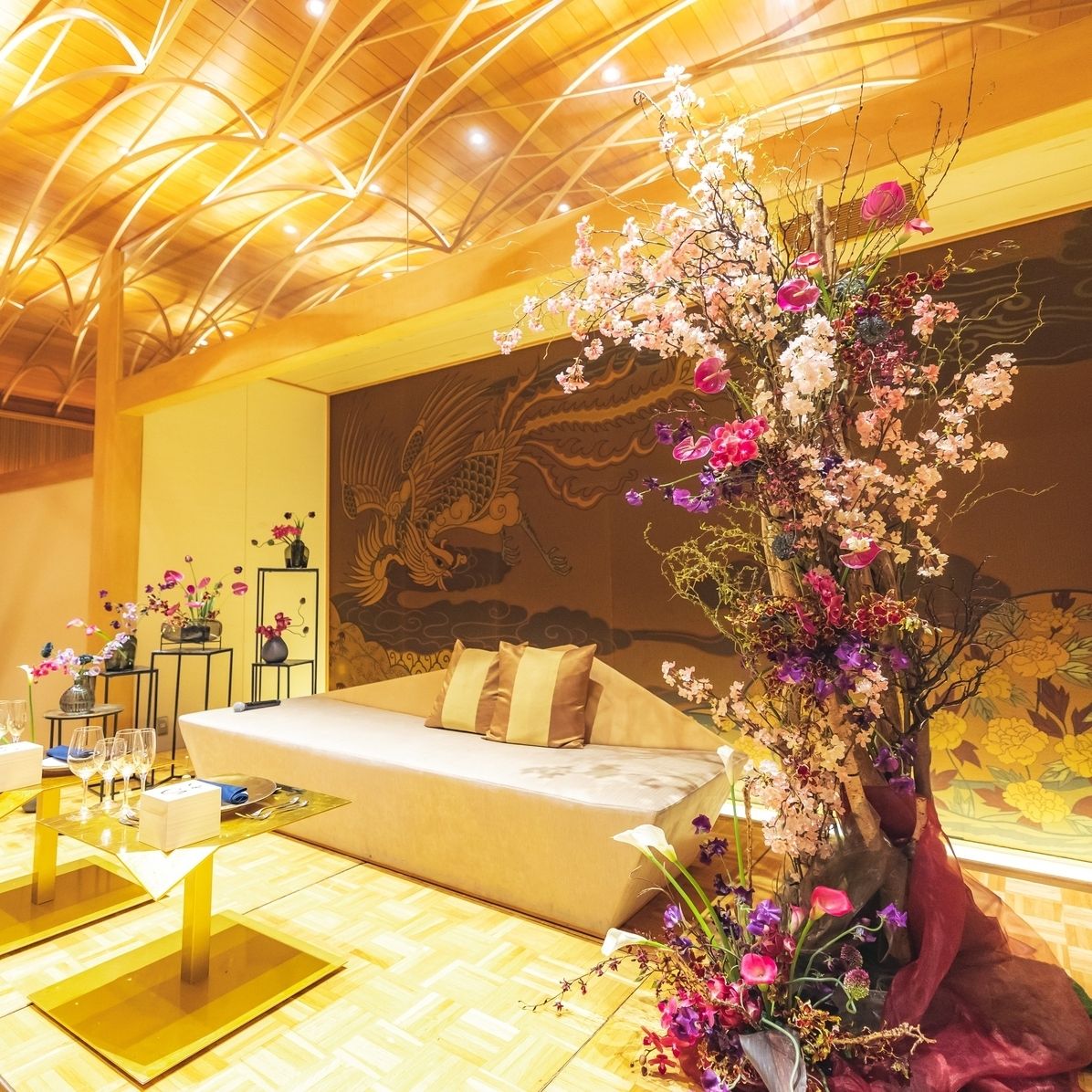 サイドに桜をメインとした木を置いてもらい、華やかな高砂になっています。