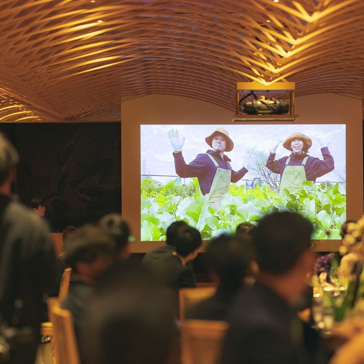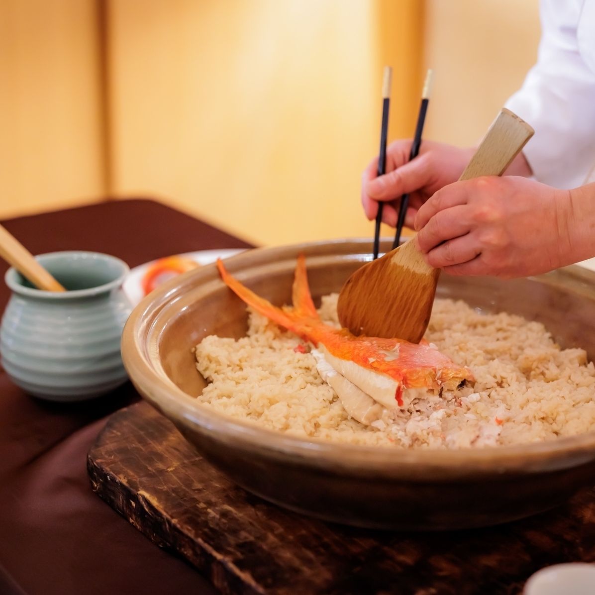 ゲストの方に喜んでもらえるよう、全てオリジナルで作っていただきました。八芳園伝統の鯛飯パフォーマンスを取り入れ、目でも楽しめるメニューにしています。