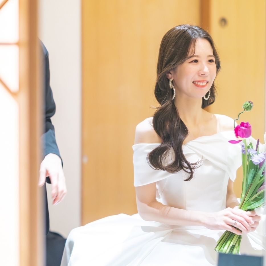 装飾等はないもののオフショルダー部分がフリルになっており、大人可愛いドレスが気に入りました!動きやすく、軽いドレスだったのも魅力的です。ゲストからも好印象でした💞