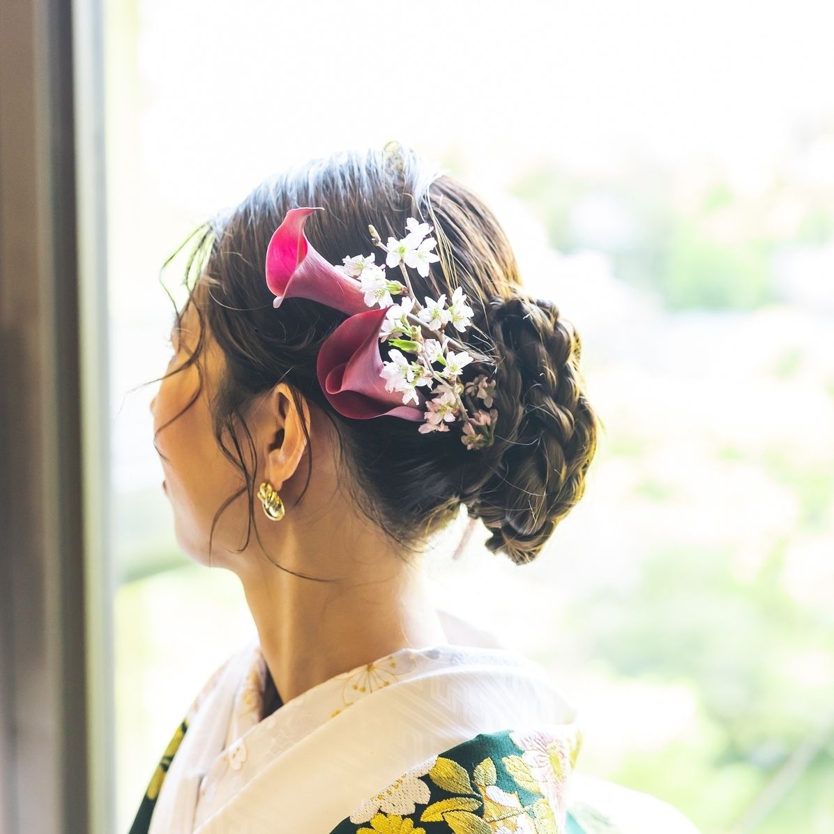 お色直し:生花×ゴールドピアス→三つ編みシニヨンに桜とカラーを挿してカッコいいスタイルにしました。