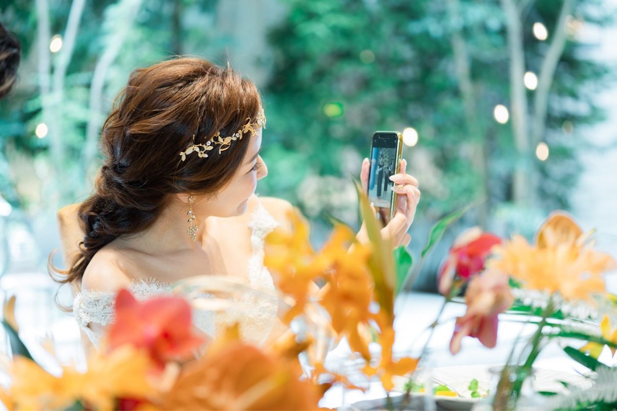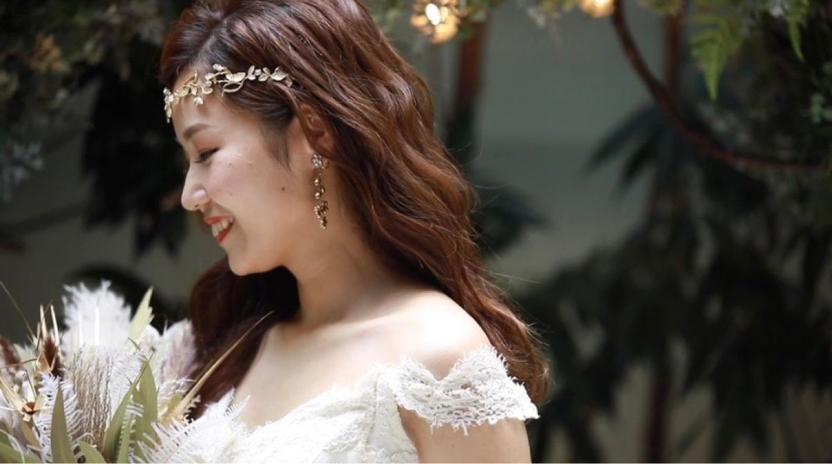 和装の時は白ベースのお花+金箔、洋装の時はゴールドのヘッドパーツをつけることで、和装〜洋装をゴールドで統一しました!