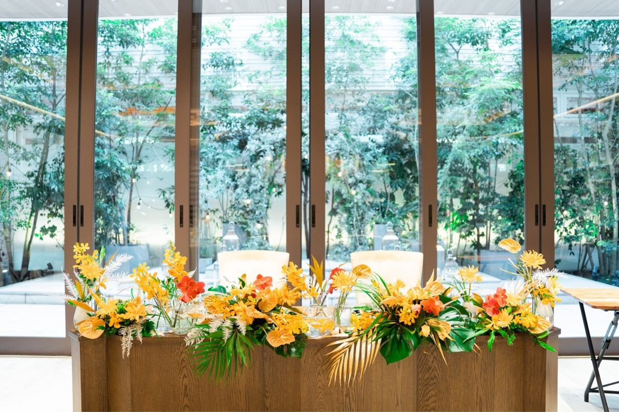 夏らしくオレンジ、テラコッタカラー、ゴールドをメインに飾っていただきました🤍アンスリウム、モンステラ、アレカヤシ、ゴールドリーフがお気に入りです!