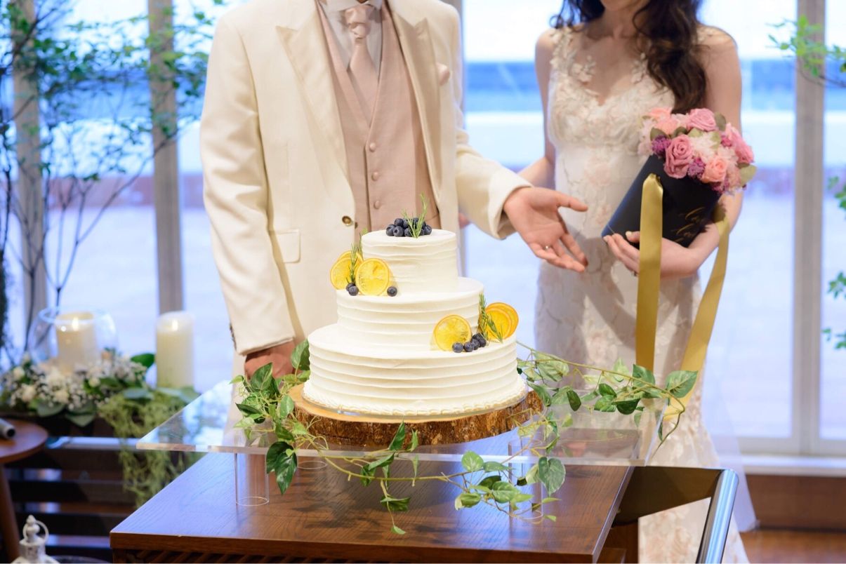 3段のシンプルな白いケーキにオレンジ、ブルーベリー、オリーブの葉をポイントで置いてもらいました。そこにケーキドロップでカラメルをかけて完成です。
